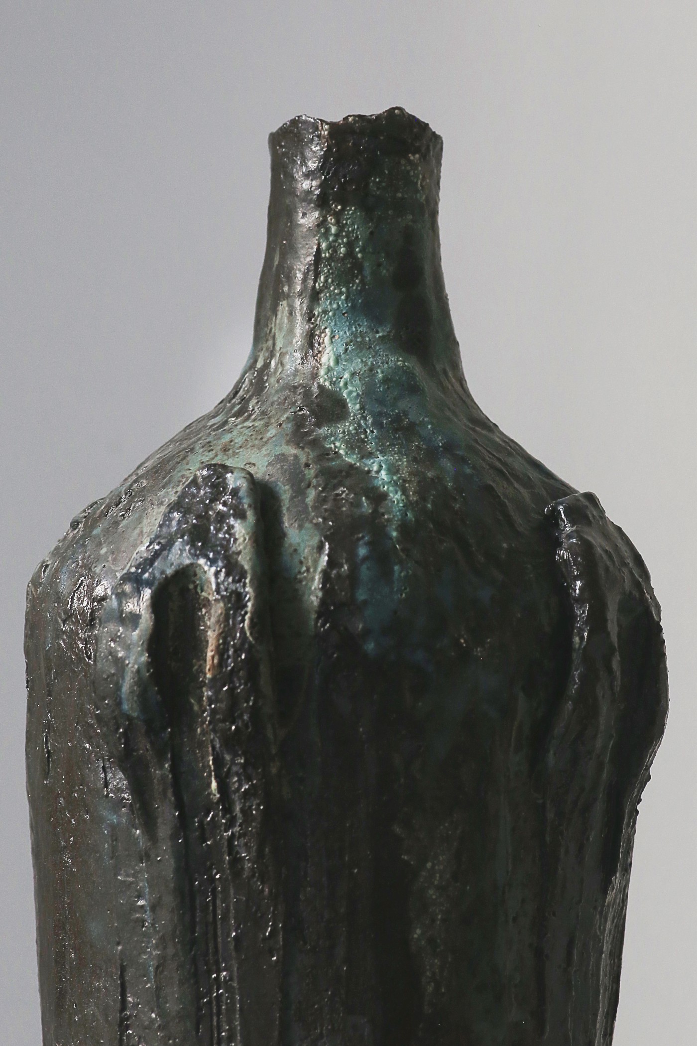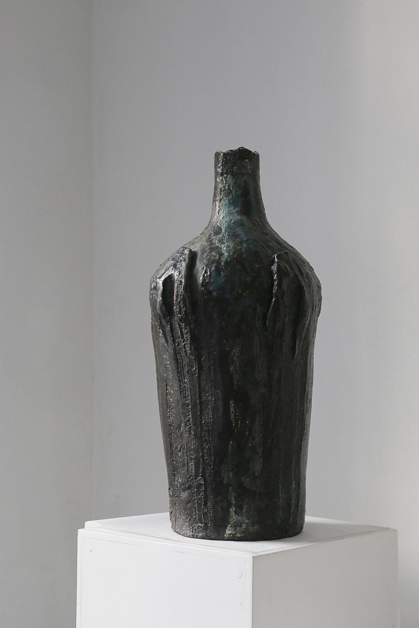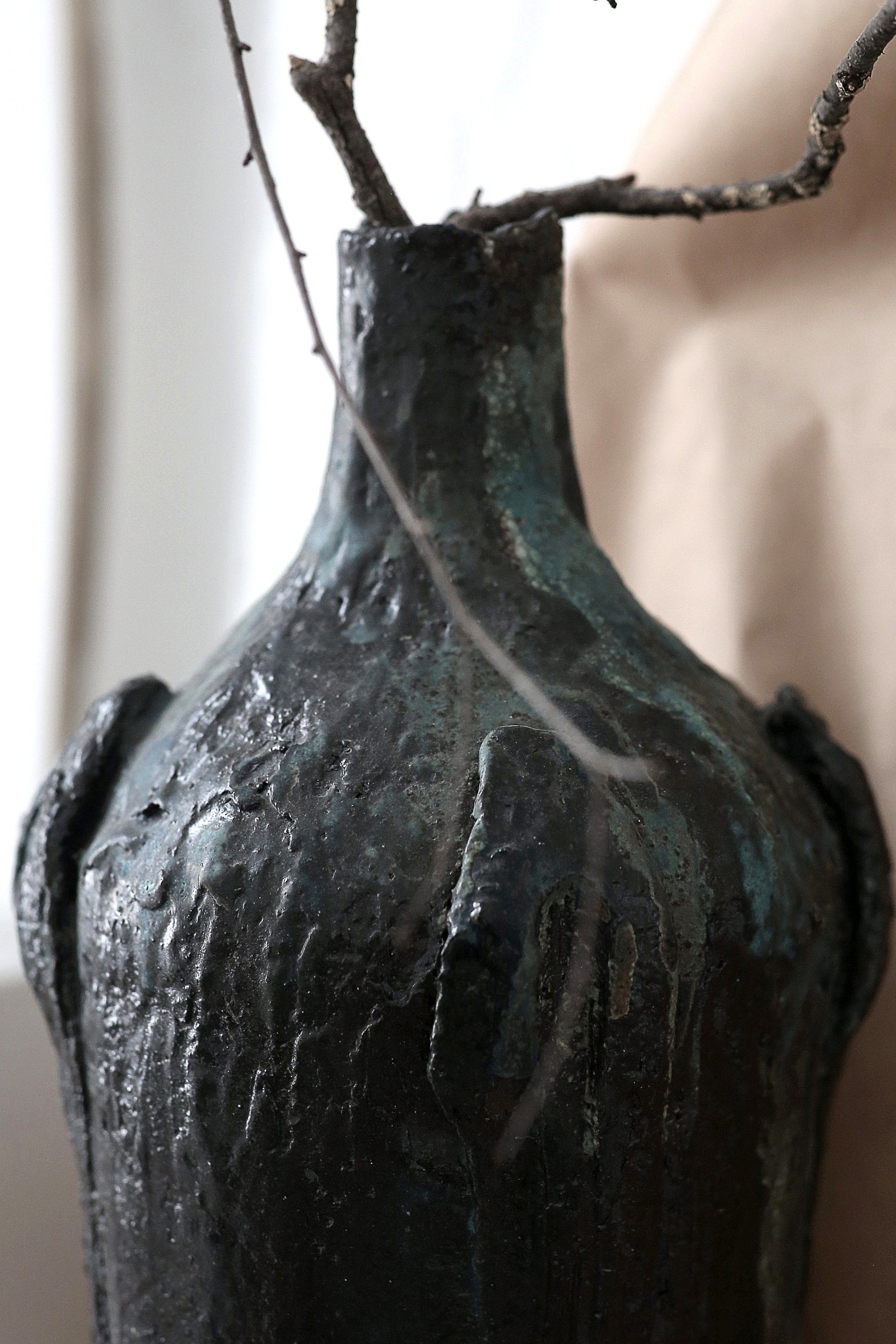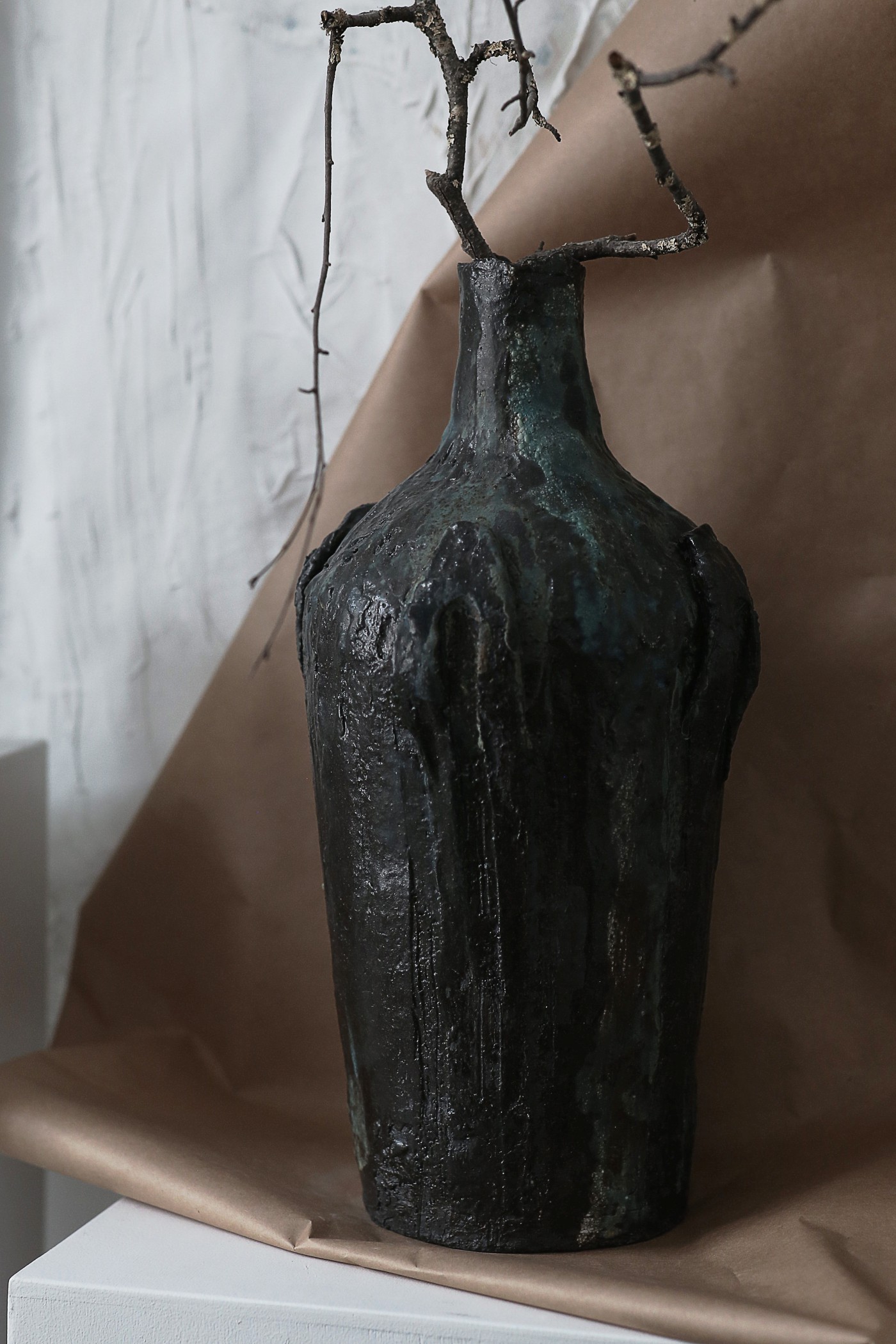 Неровная бутылочная вертикальная форма. Поверхность матовая и полуматовая - шершавая. Общий цвет темно-коричневый. Фрагментарные оттенки окислившегося металла - зеленого тона. Функциональная ваза для живых больших веток.