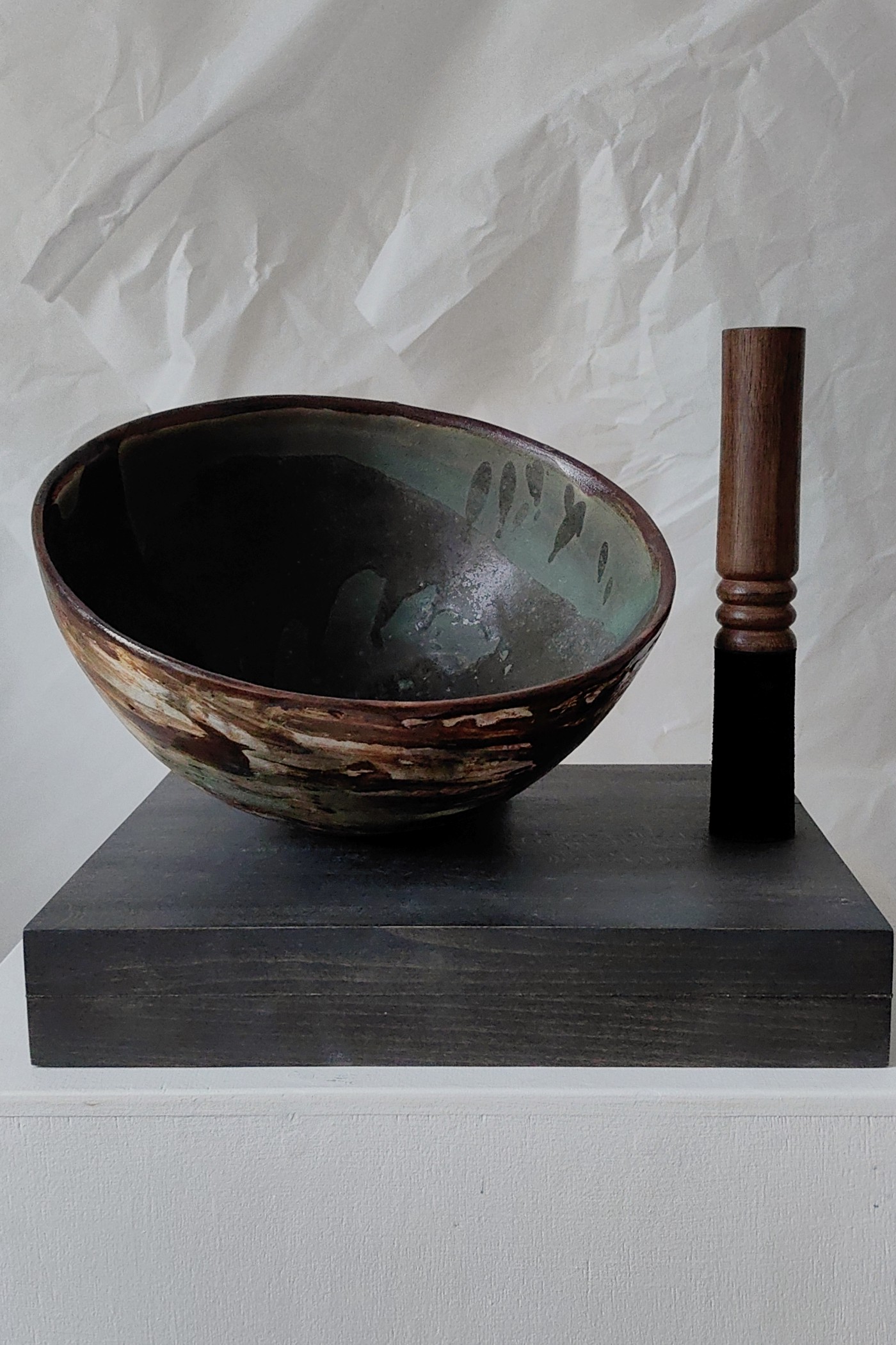 Керамическая поющая чаша в форме полусферы. В комплекте деревянный резонатор.
