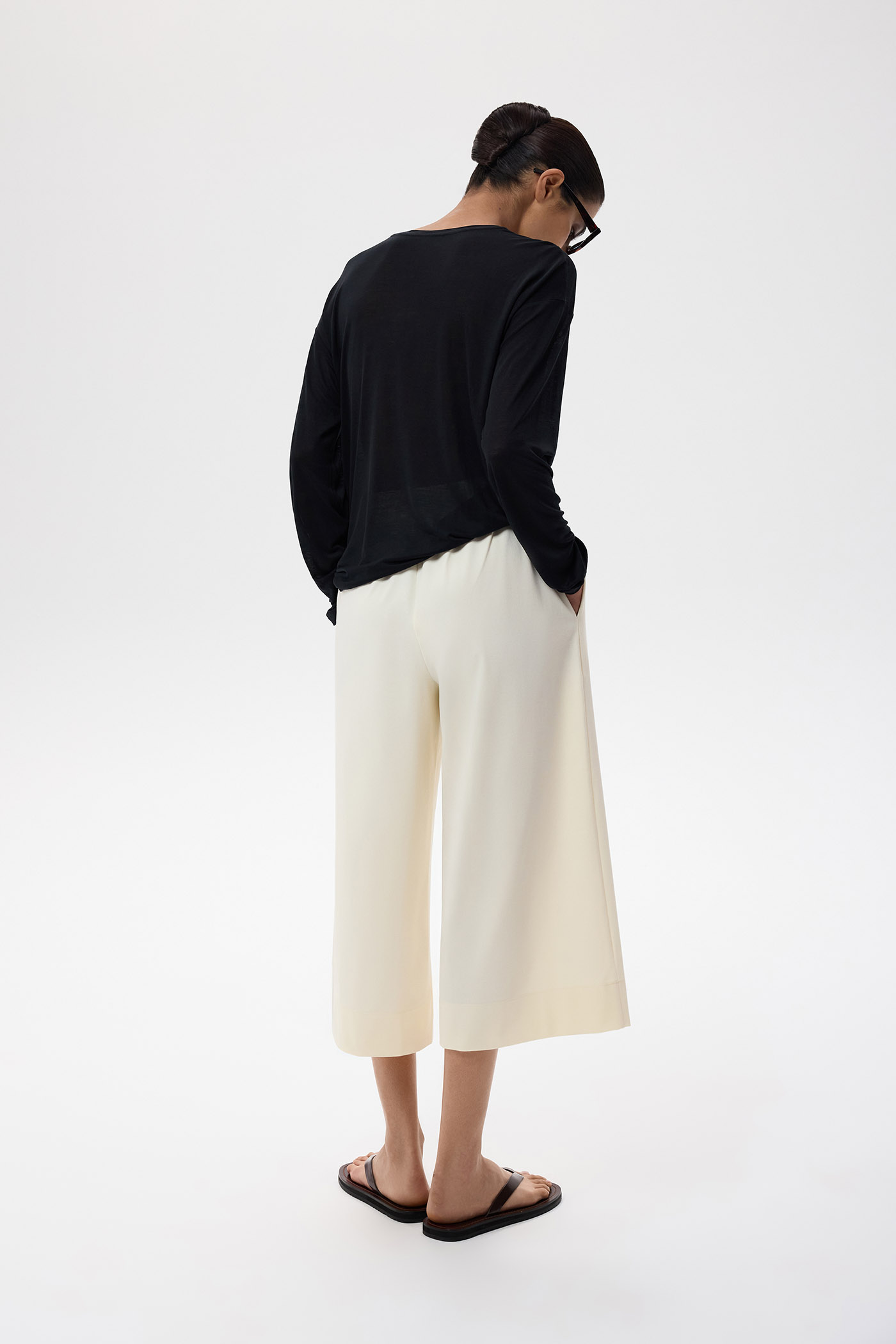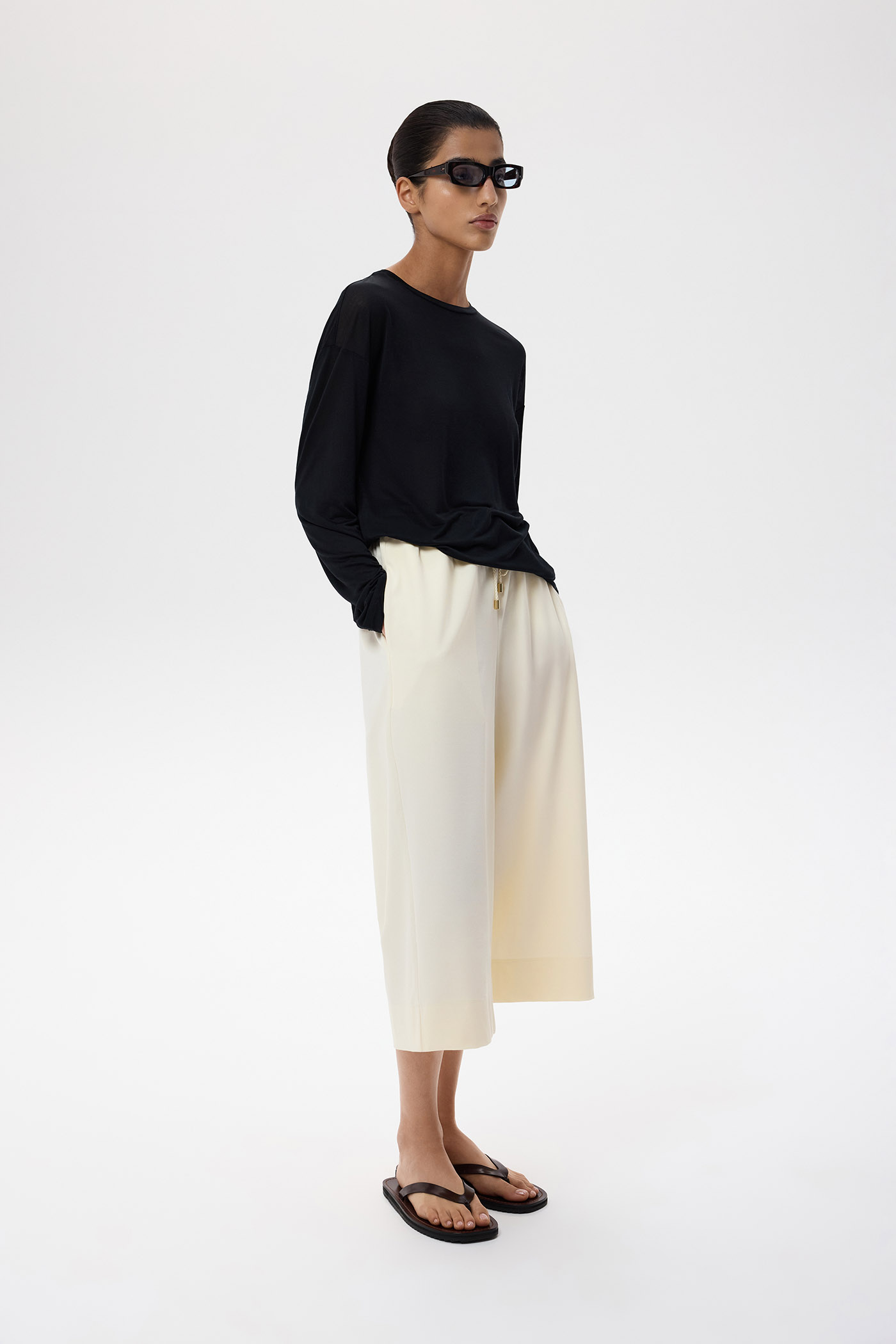 Брюки-капри из трикотажного полотна средней посадки, поясом на шнурке и карманами в боковых швах.