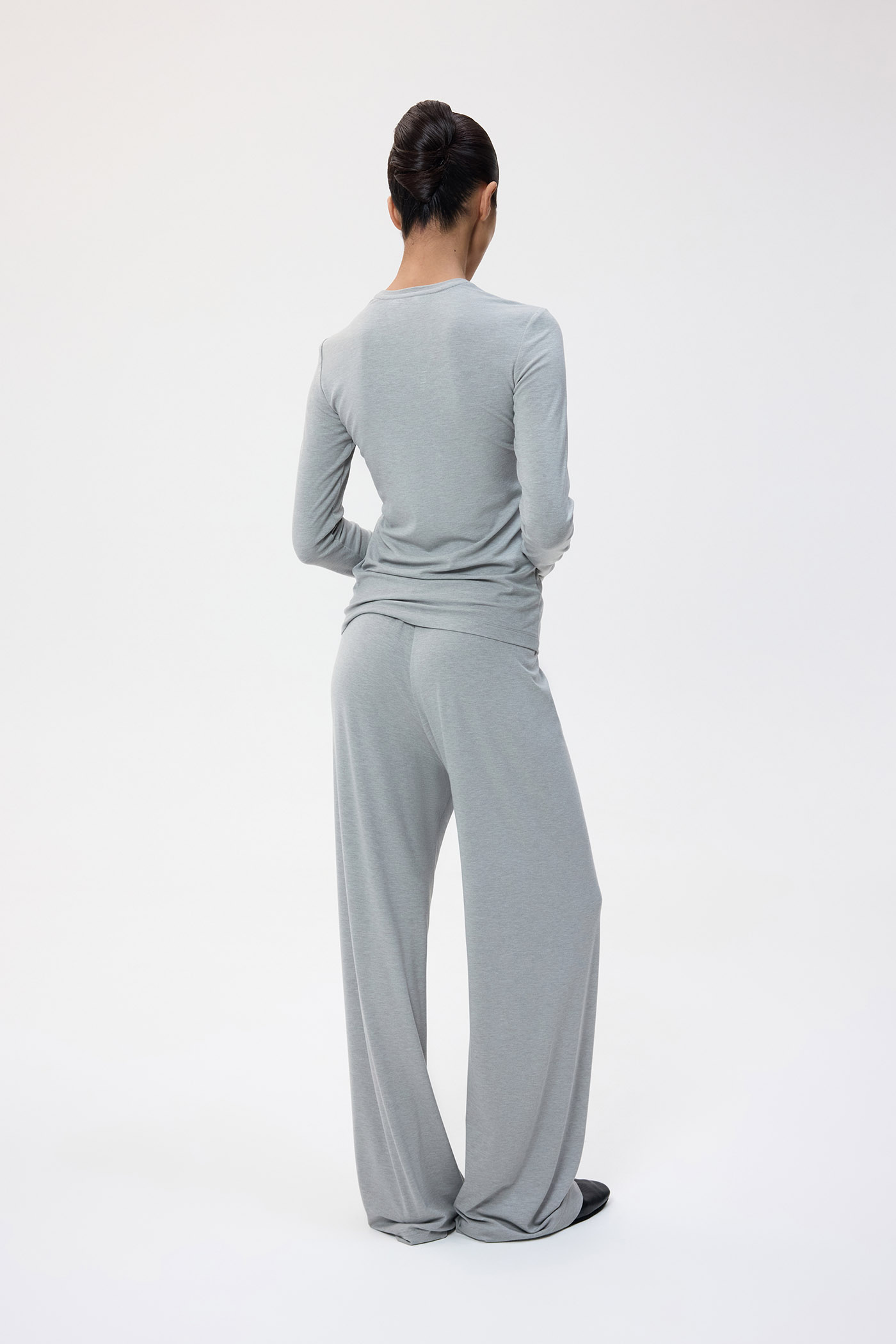 Брюки свободного кроя с эластичной резинкой на поясе из трикотажного полотна.