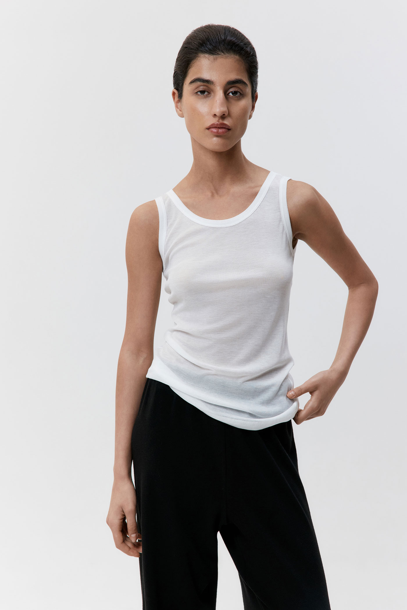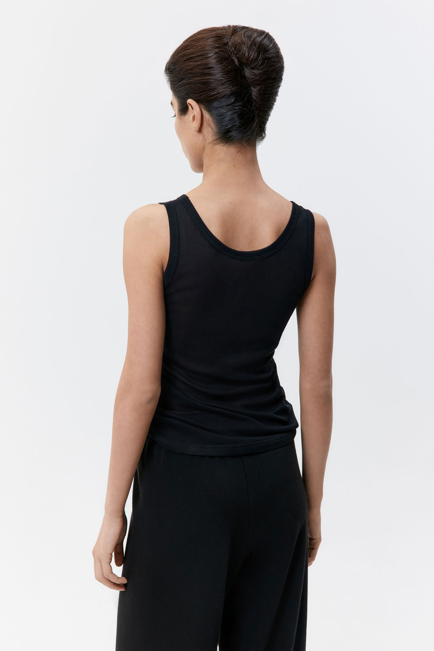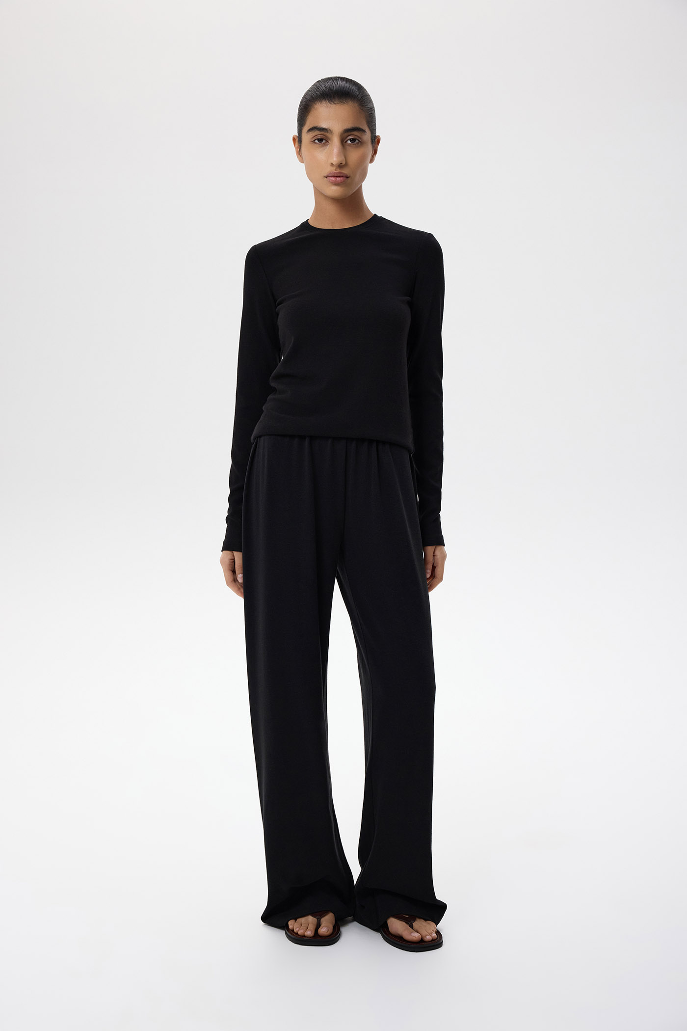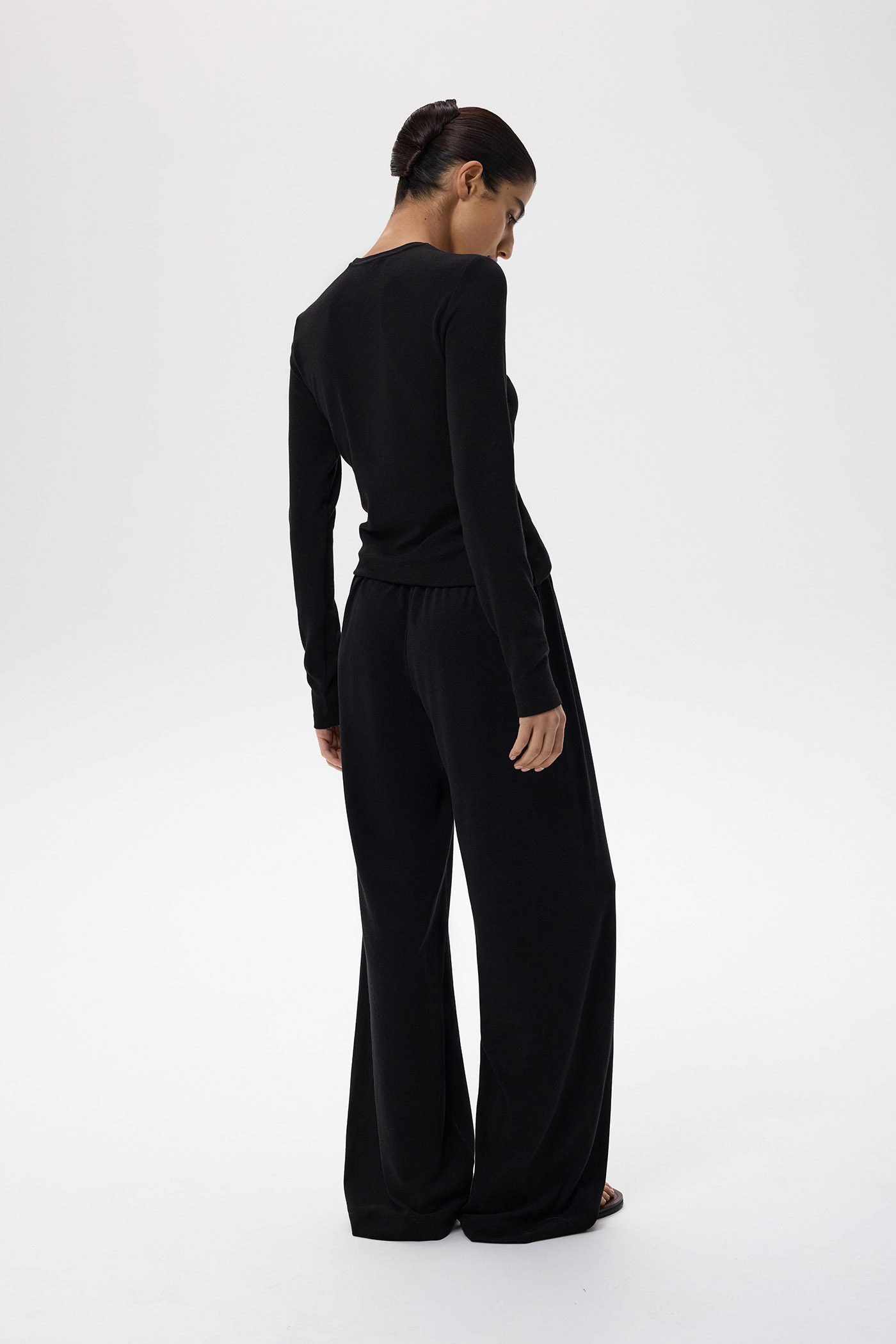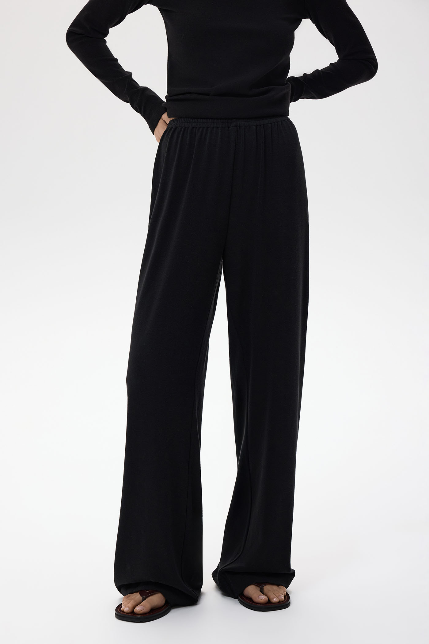 Брюки на резинке свободного кроя.