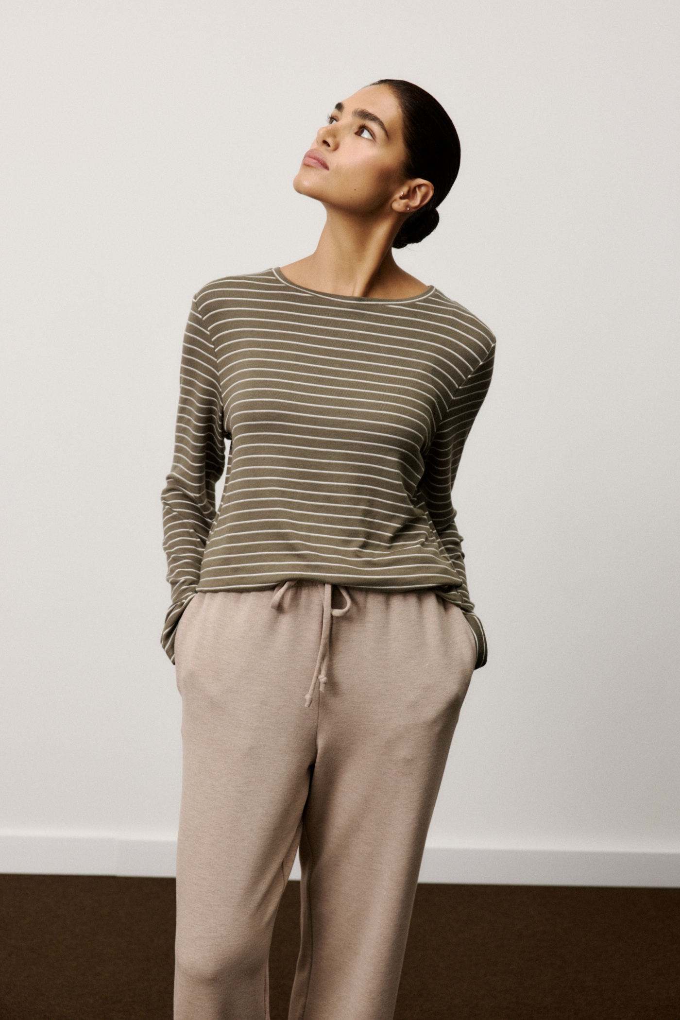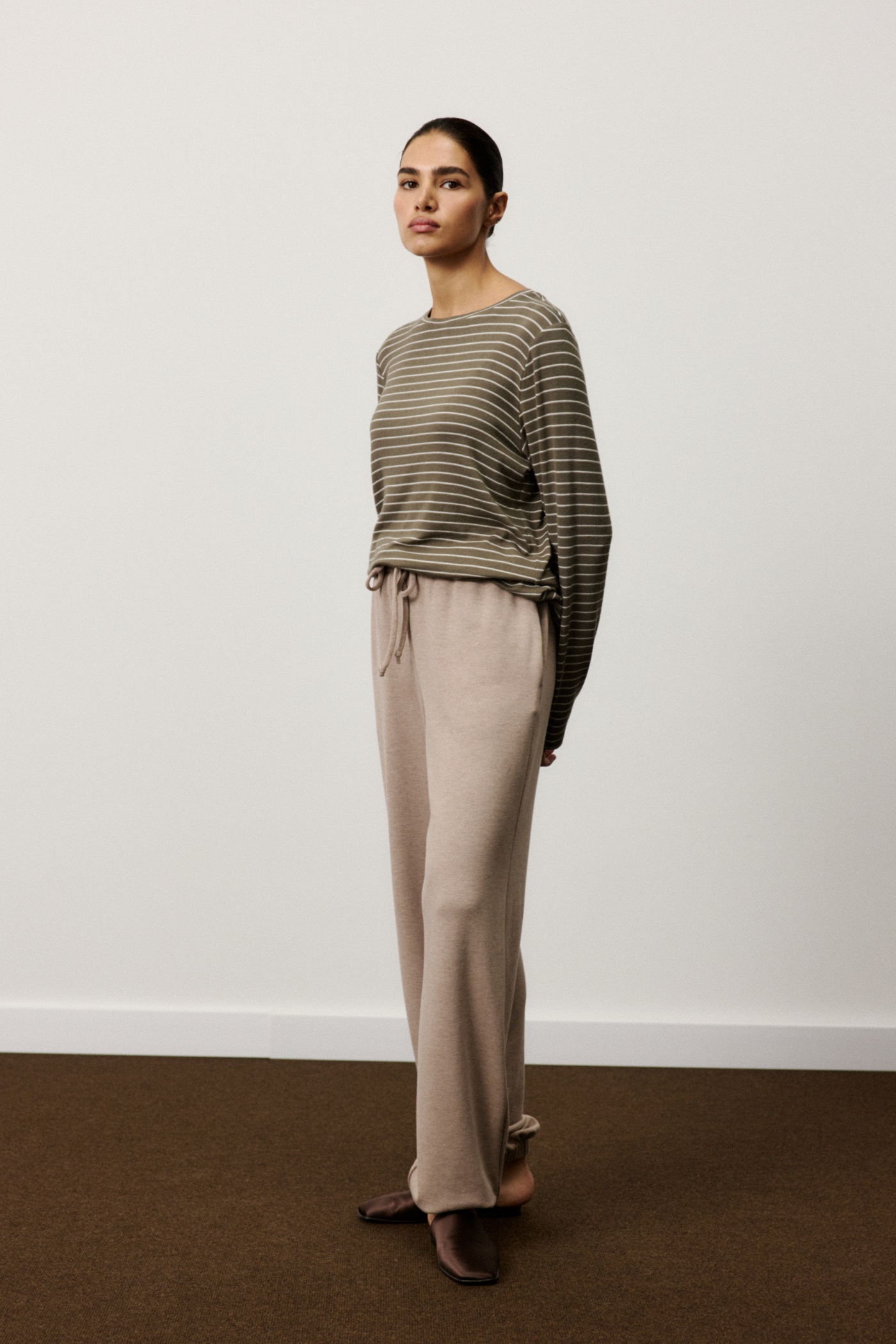 Брюки на кулиске с карманами в боковых швах из плотного теплого трикотажа.
