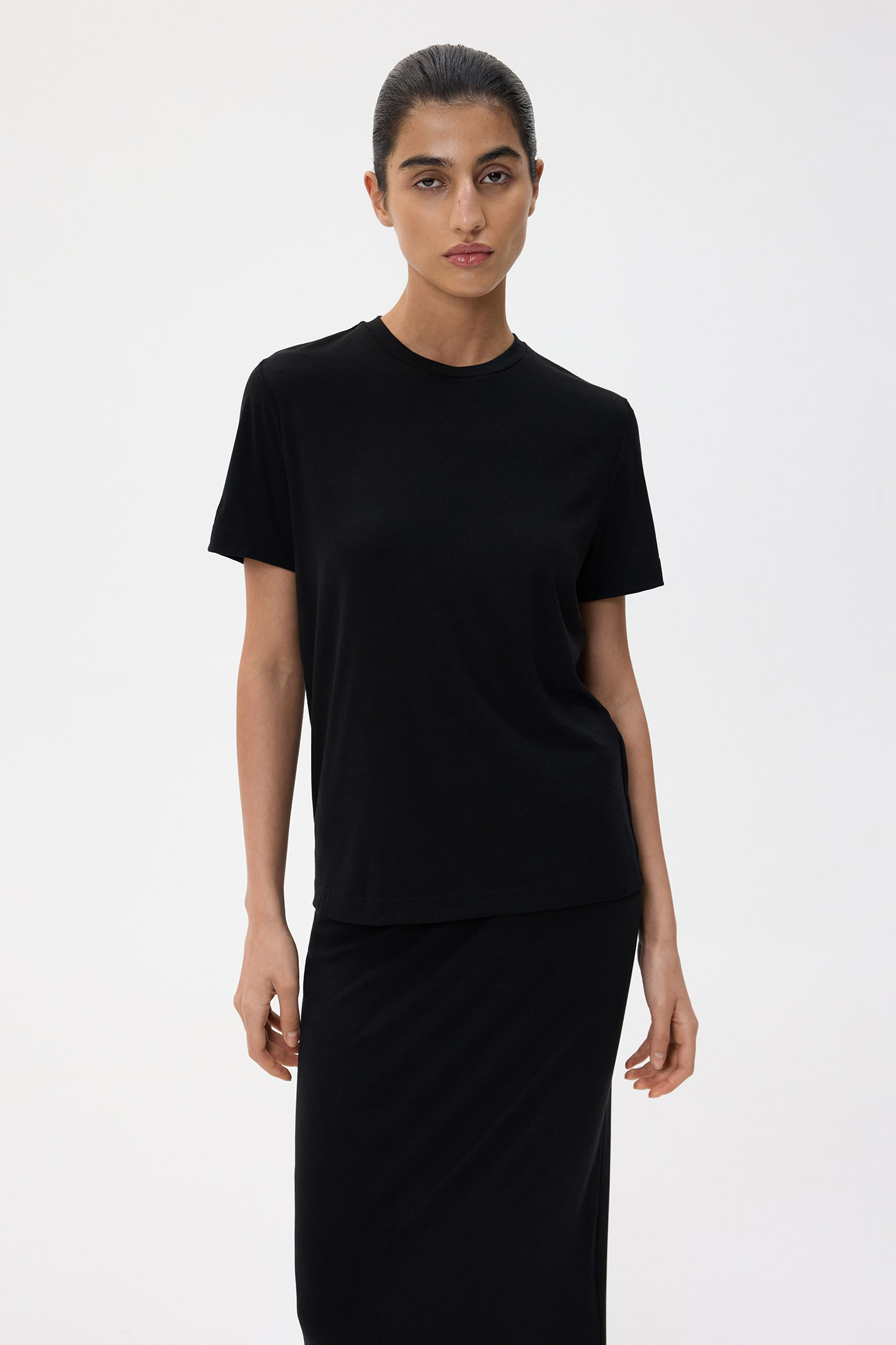 Футболка прямого кроя из мягкого и пластичного трикотажа на основе вискозы. Благодаря смесовому составу ткань красиво драпируется, почти не мнется и долго сохраняет первоначальный вид. Материал приятен на ощупь и позволяет коже дышать, а добавление эластичных волокон обеспечивает свободу движений и комфорт в течение всего дня.