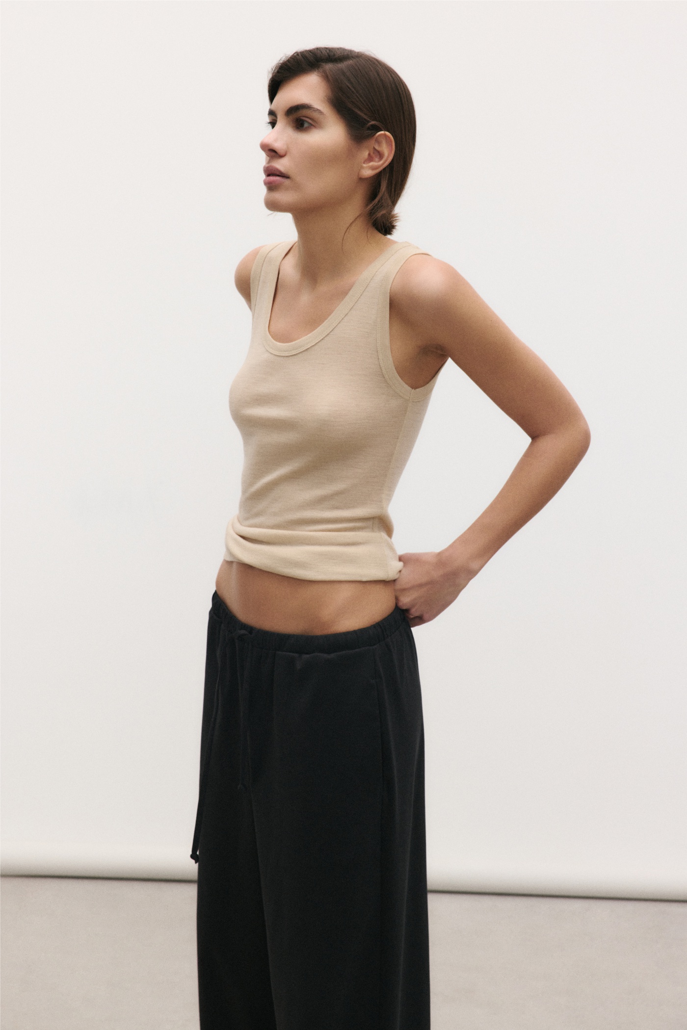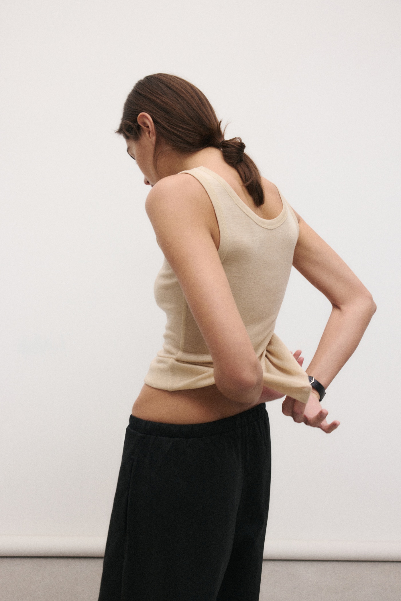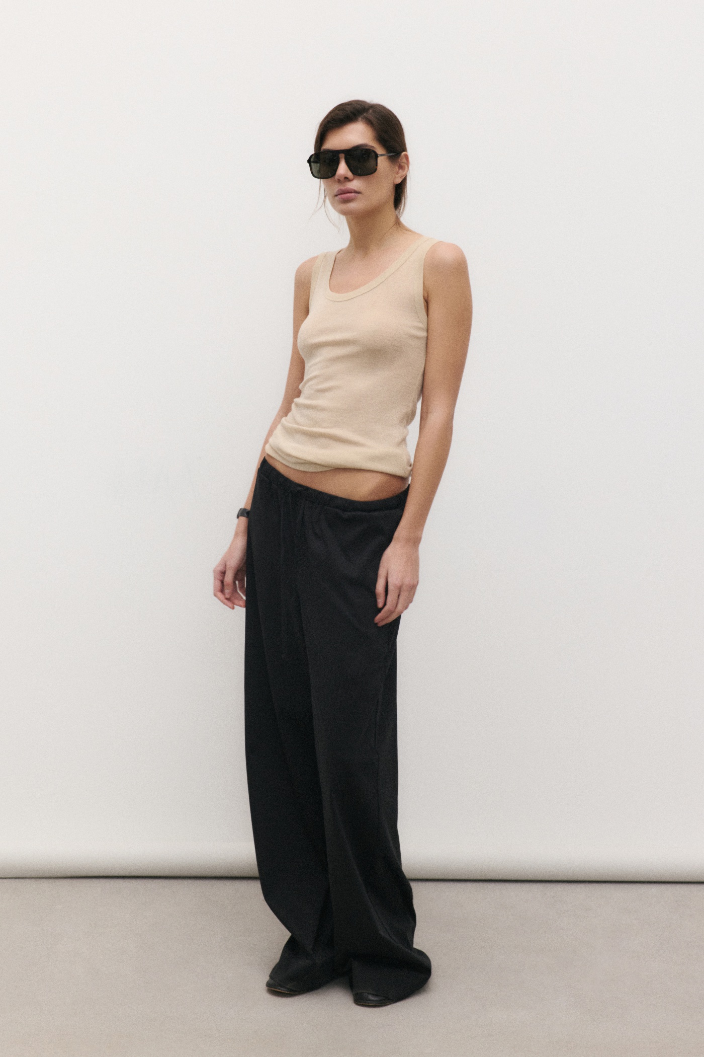 Майка на бретелях приталенного силуэта из премиального трикотажа.