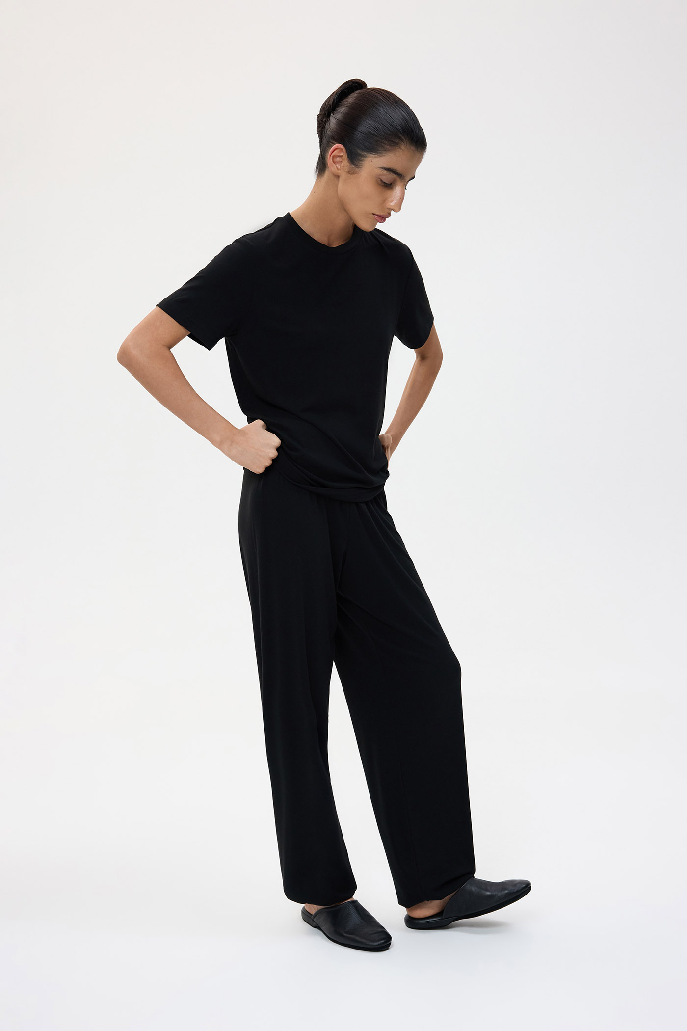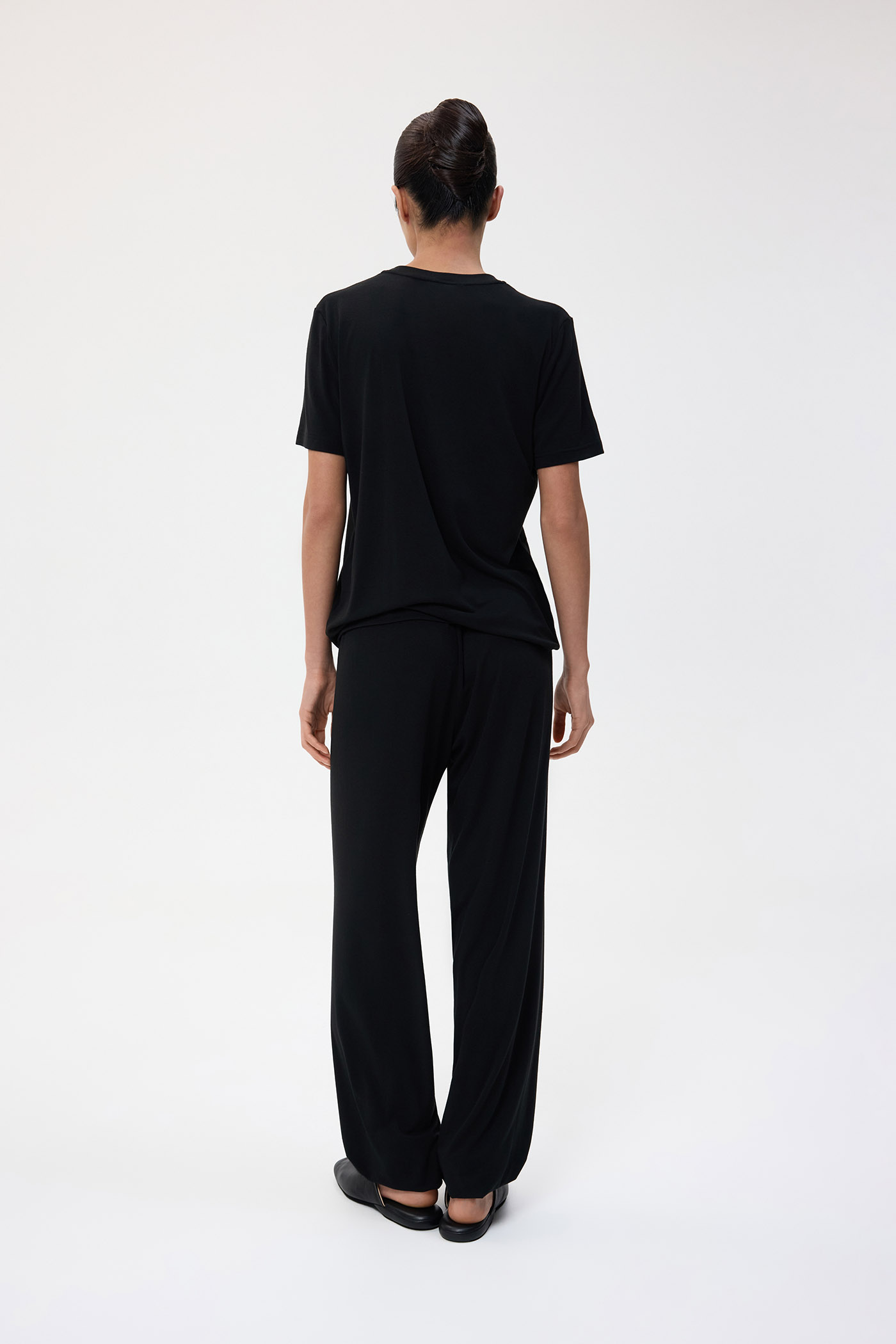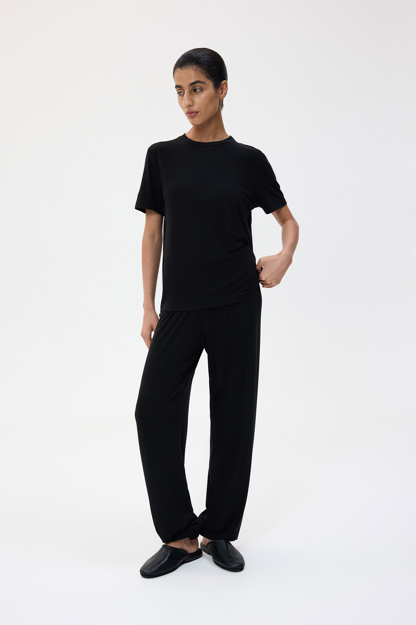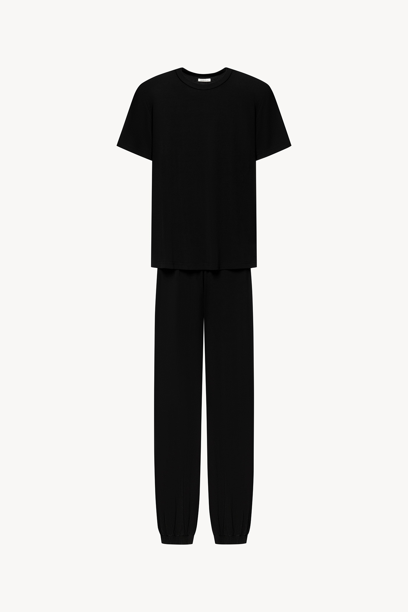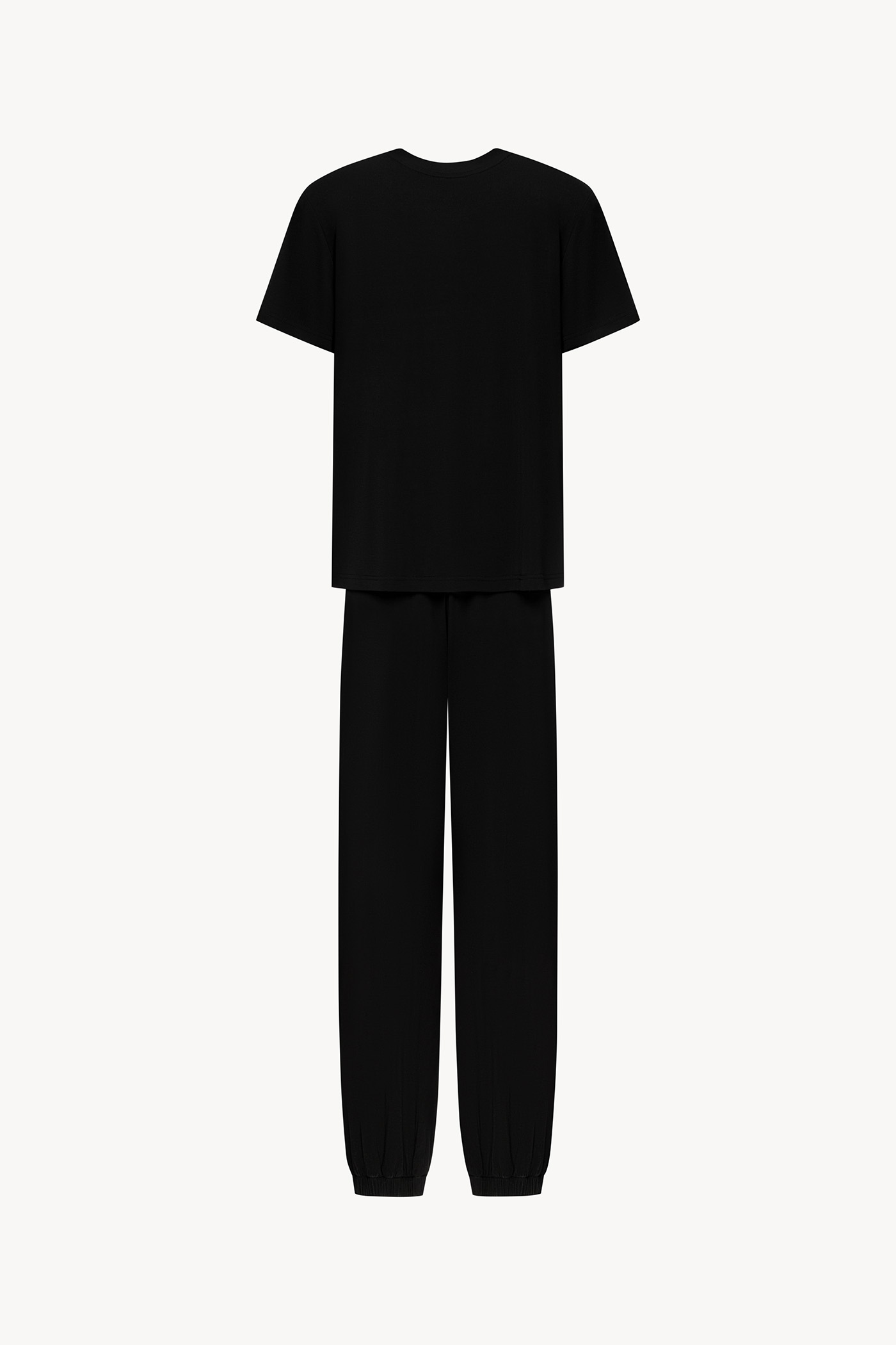 Комплект из футболки и джоггеров, выполненный из нежного смесового трикотажа. Ткань отличается особой мягкостью и легкостью, она красиво струится по фигуре, не ограничивая движений. Благодаря сочетанию натуральных и технологичных волокон материал отлично держит форму, приятен к телу в летнюю погоду и сохраняет свой первоначальный вид после многих стирок.