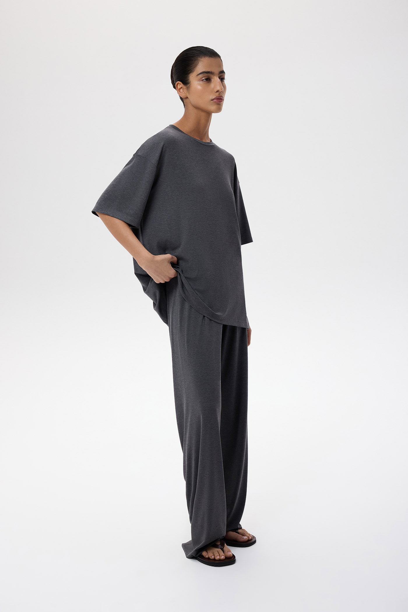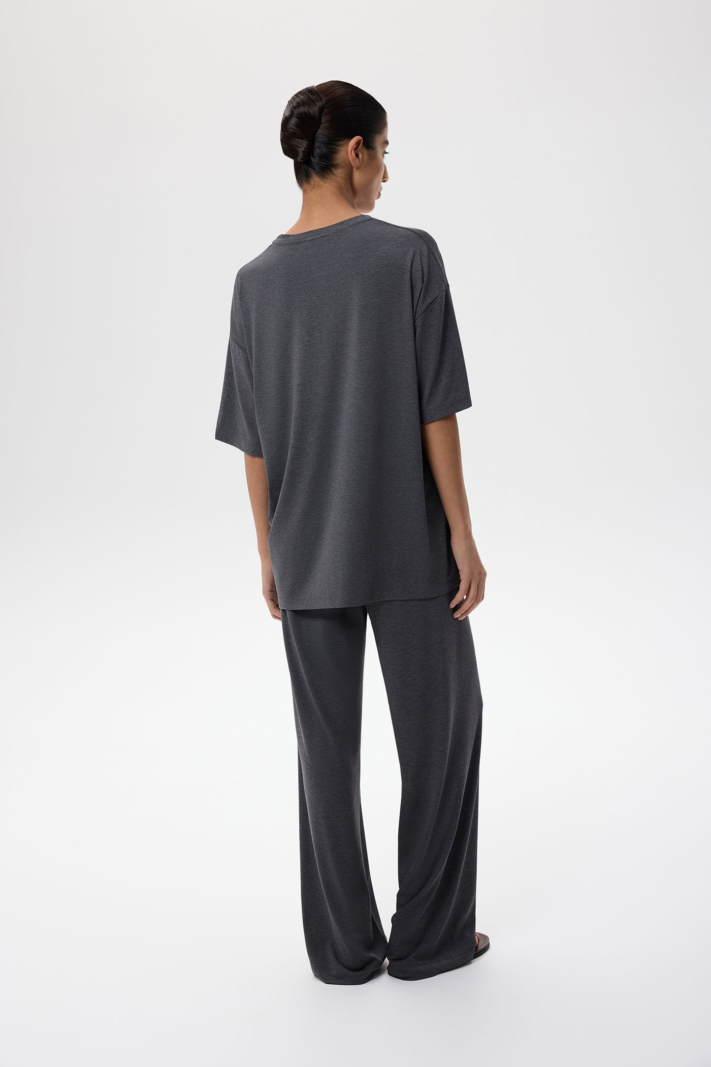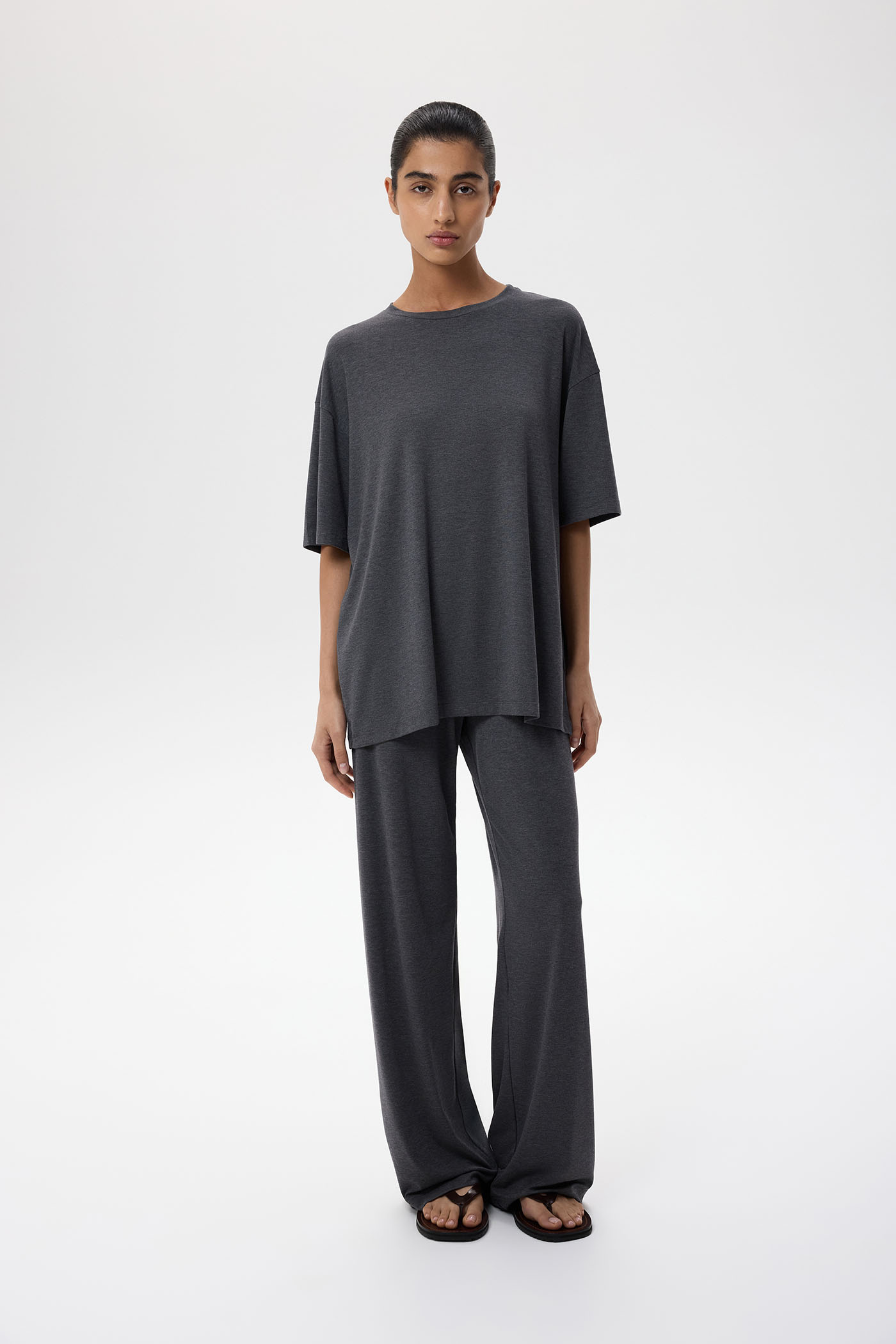 Футболка свободного кроя и брюки на резинке из шелковистого трикотажа.