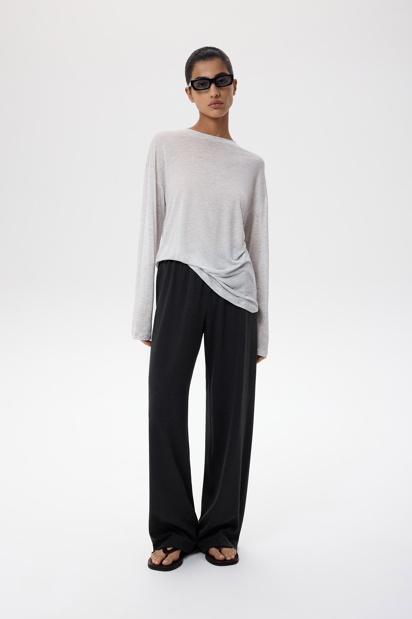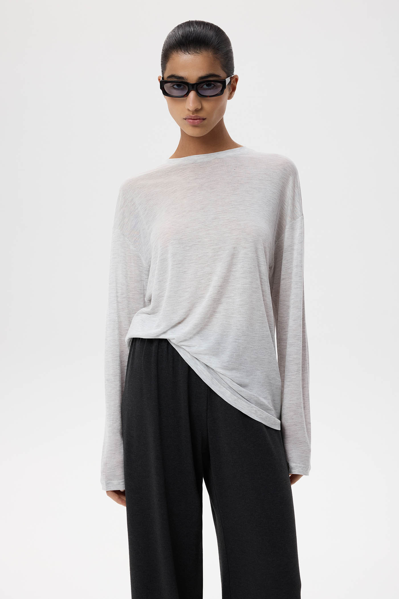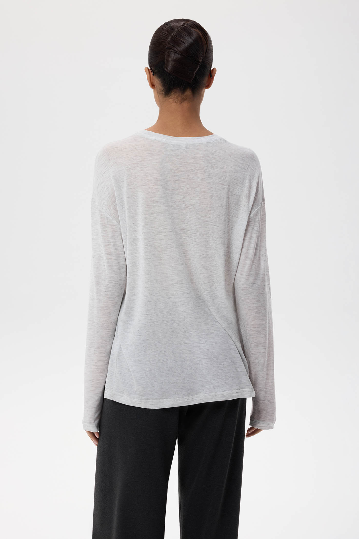 Лонгслив свободного кроя из прозрачного шелковистого трикотажа.