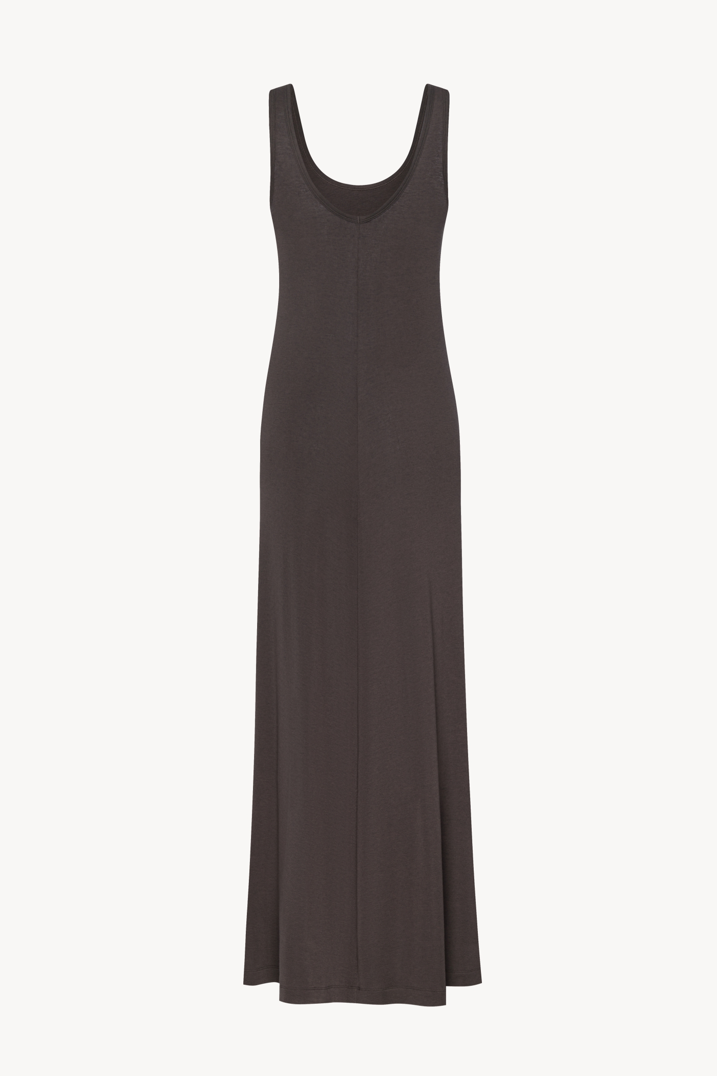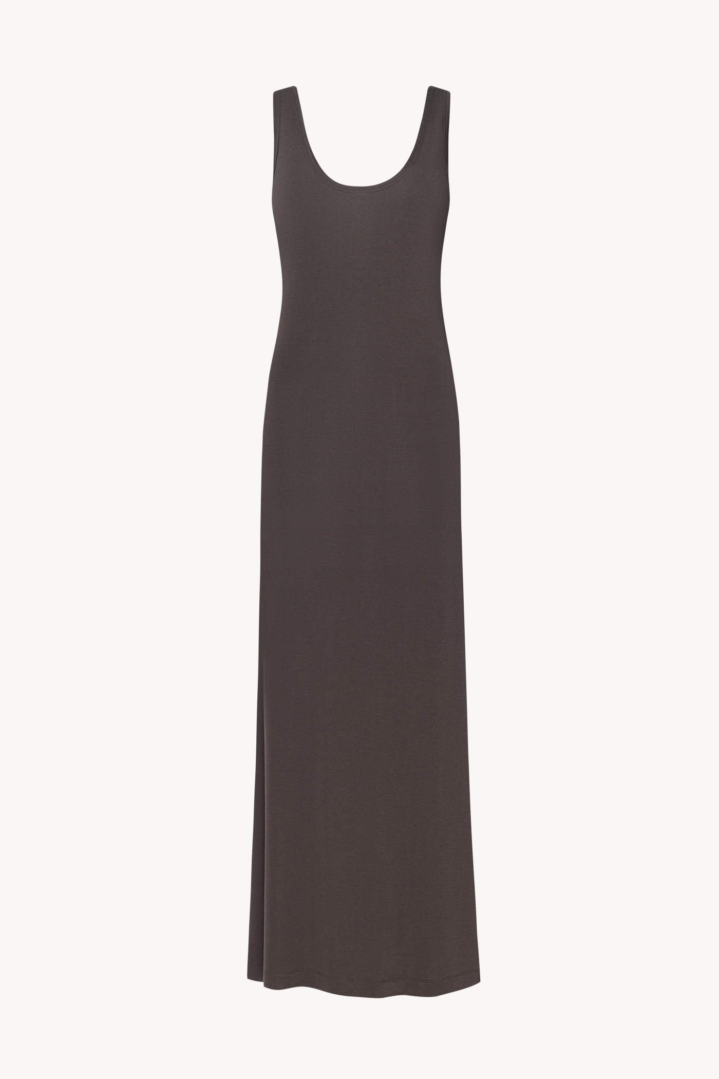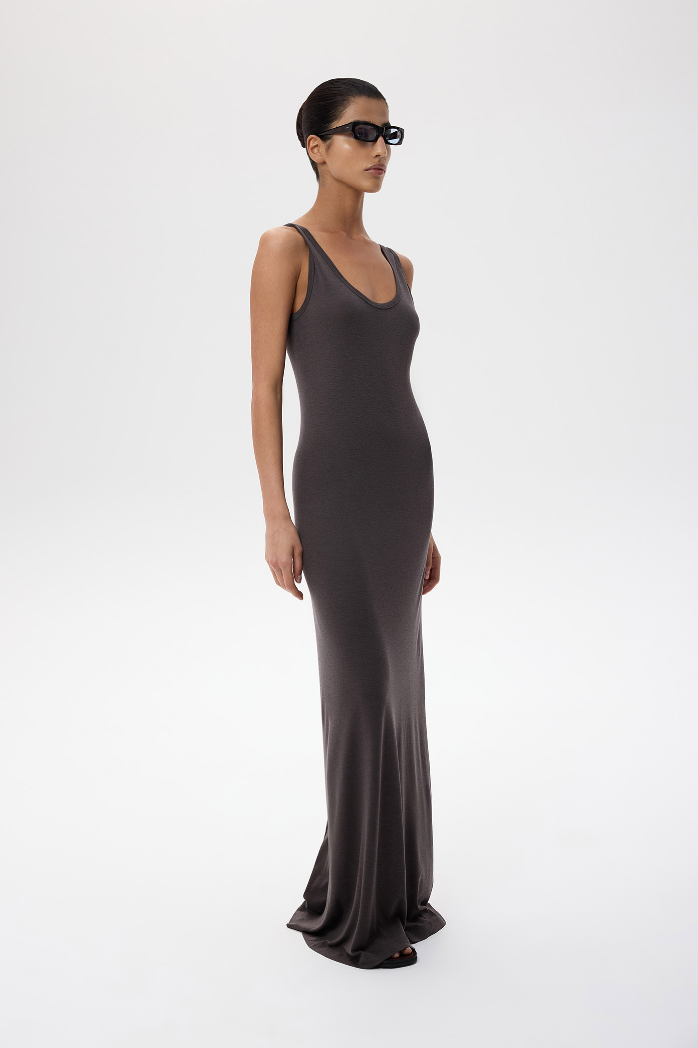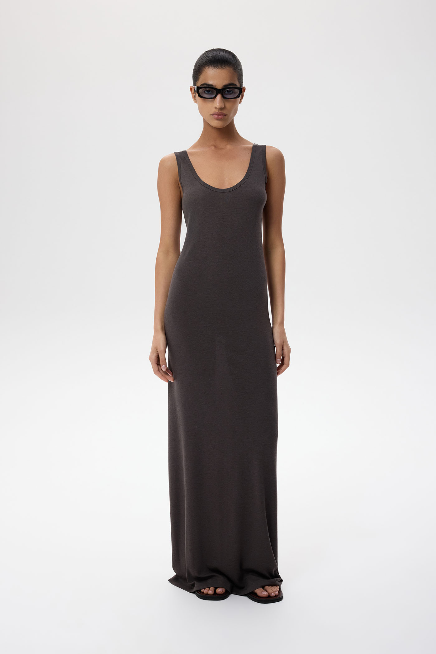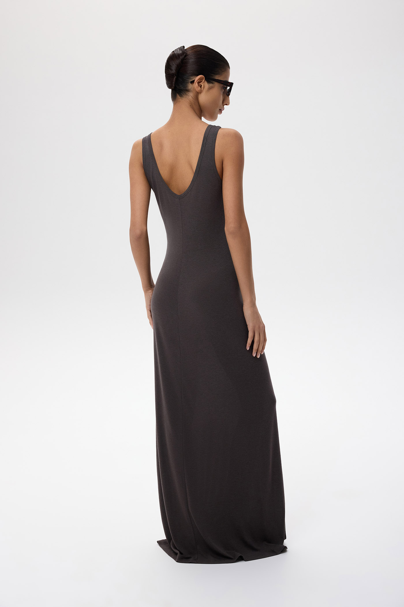 Платье длины макси со швом на спине из невесомого шелковистого трикотажа.