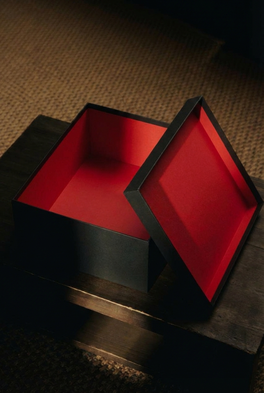 Премиальная коробка из плотного переплетного картона. Внешнее матовое покрытие черного цвета контрастирует с внутренней отделкой в оттенке «императорский красный». Фирменный логотип нанесен объемным лаком. Идеальный выбор для особенного подарка.