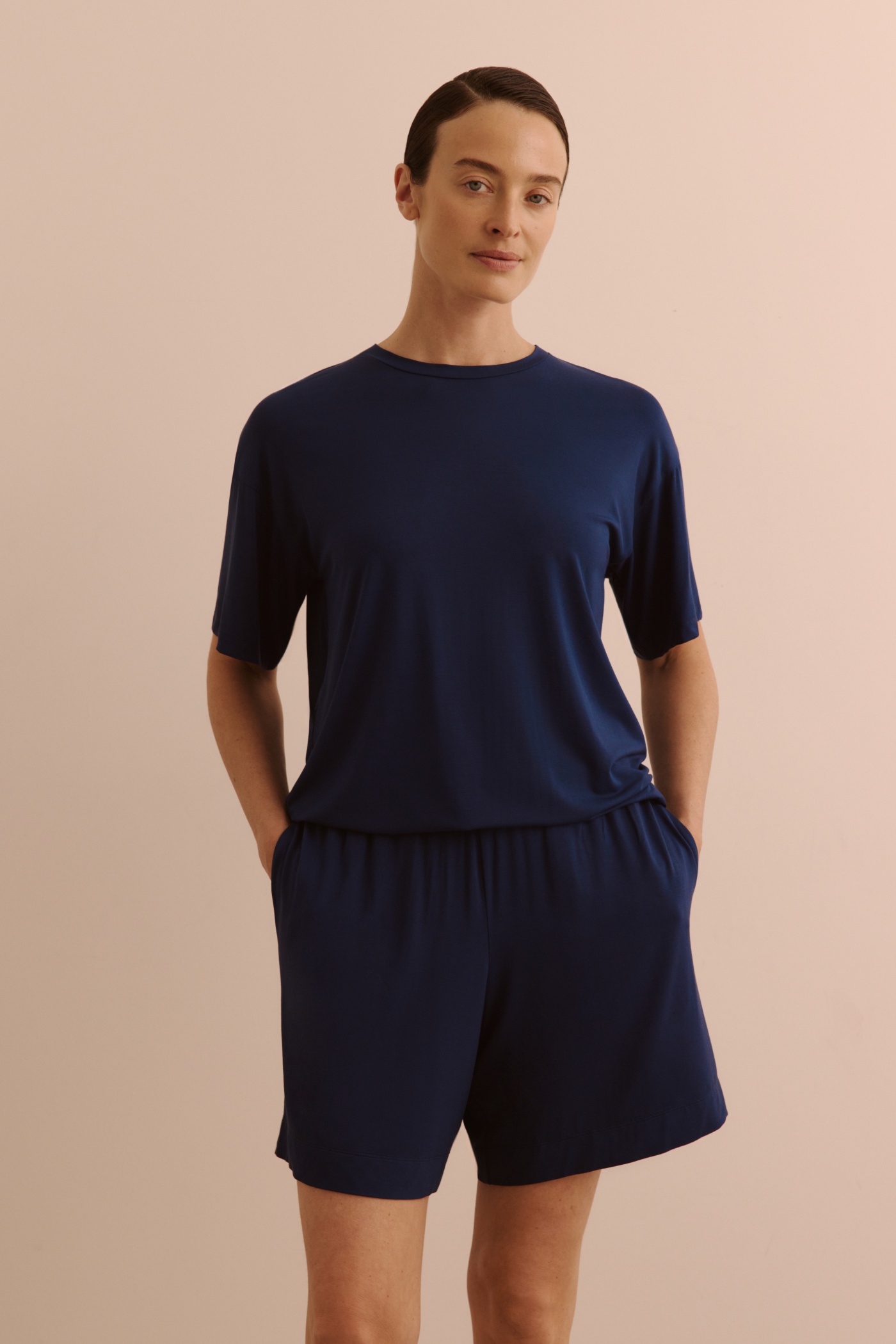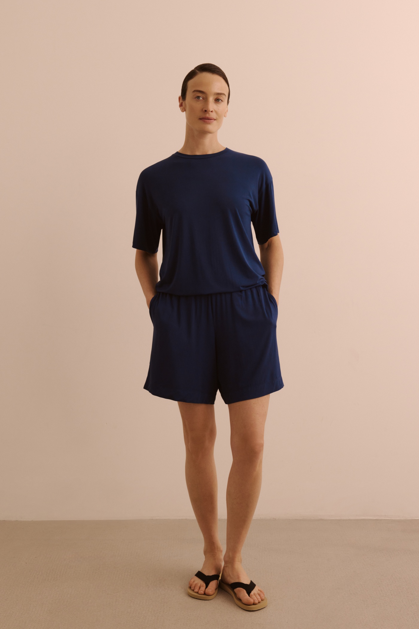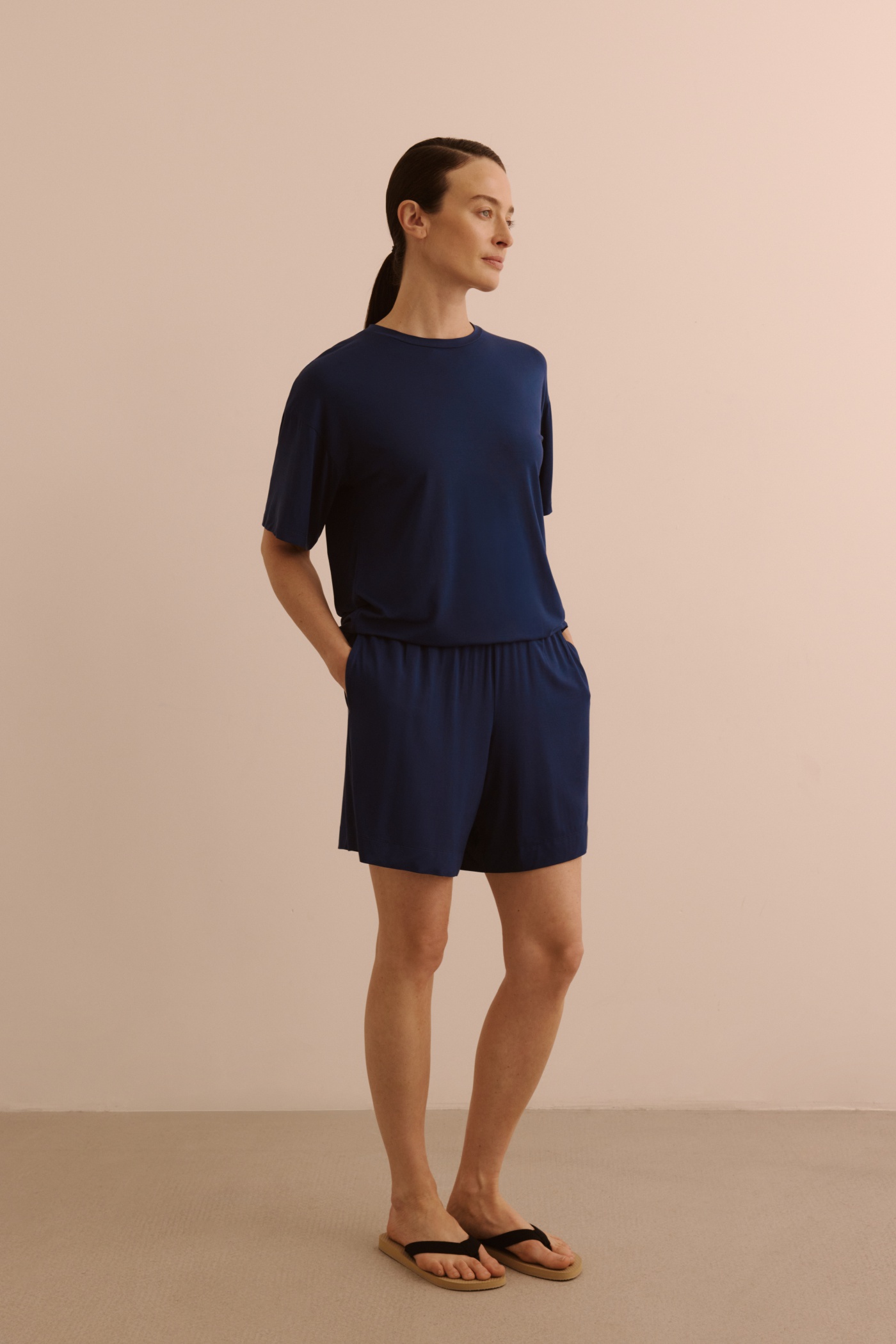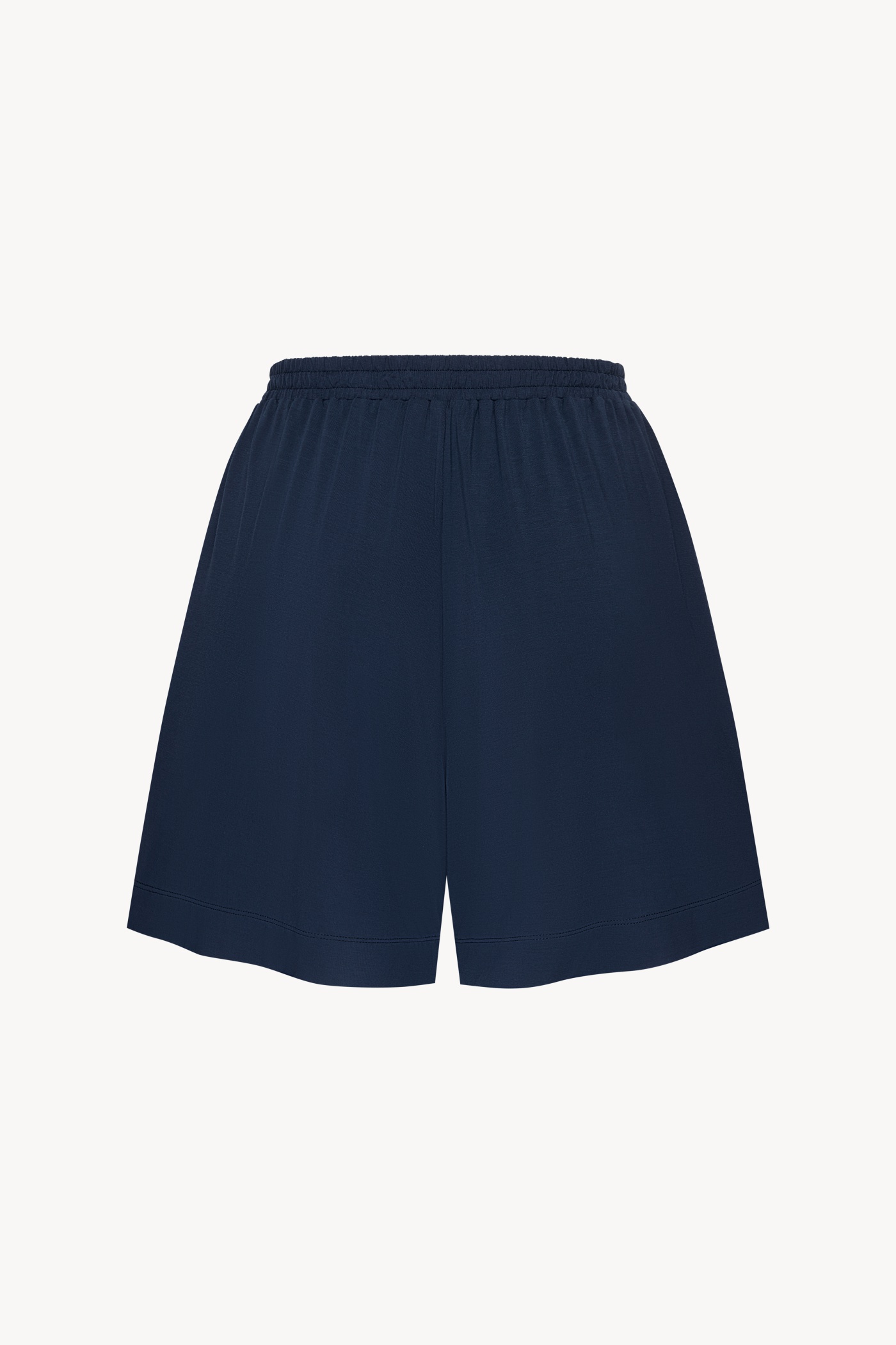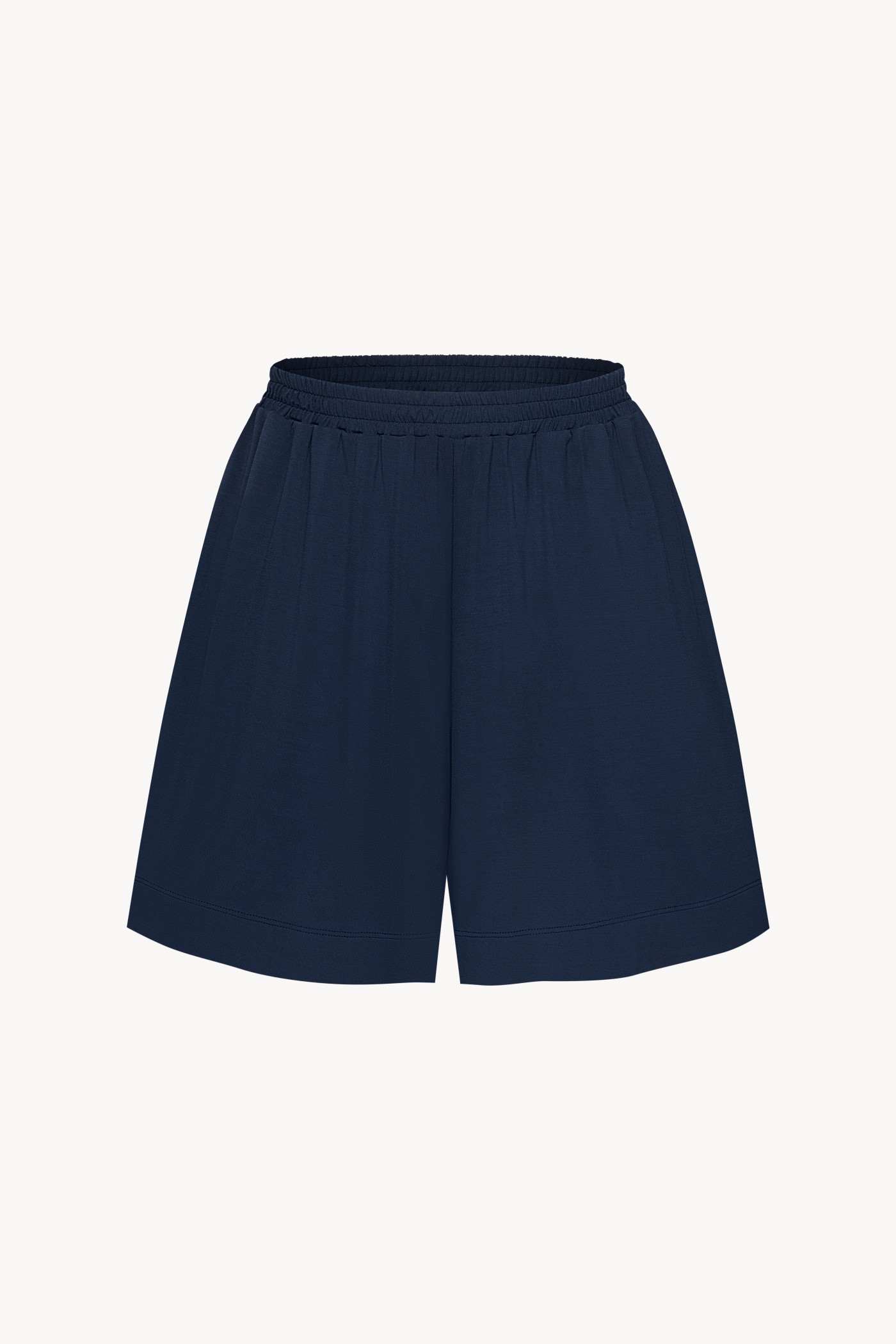 Шорты длиной до колена с эластичным поясом на резинке, карманами в боковых швах.