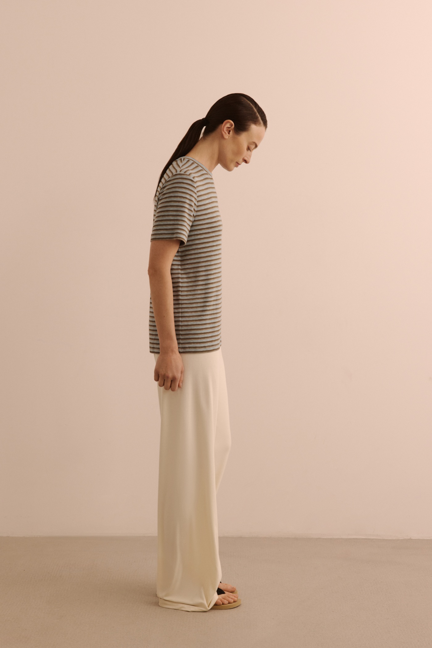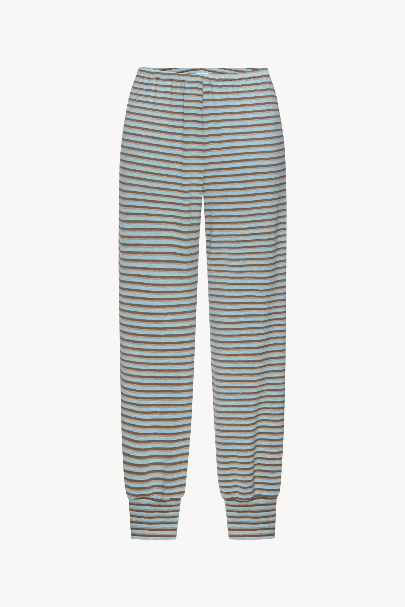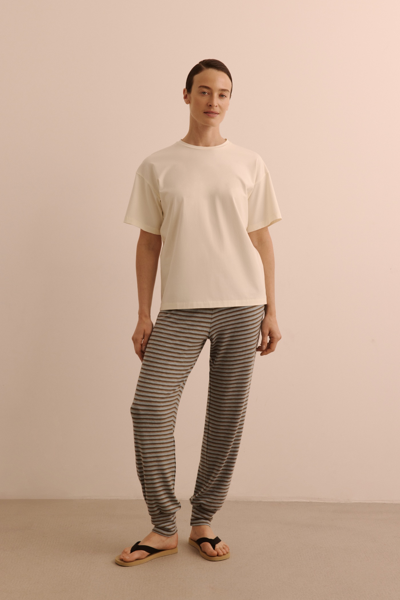 Брюки-джоггеры на резинке и футболка прямого кроя в полоску.