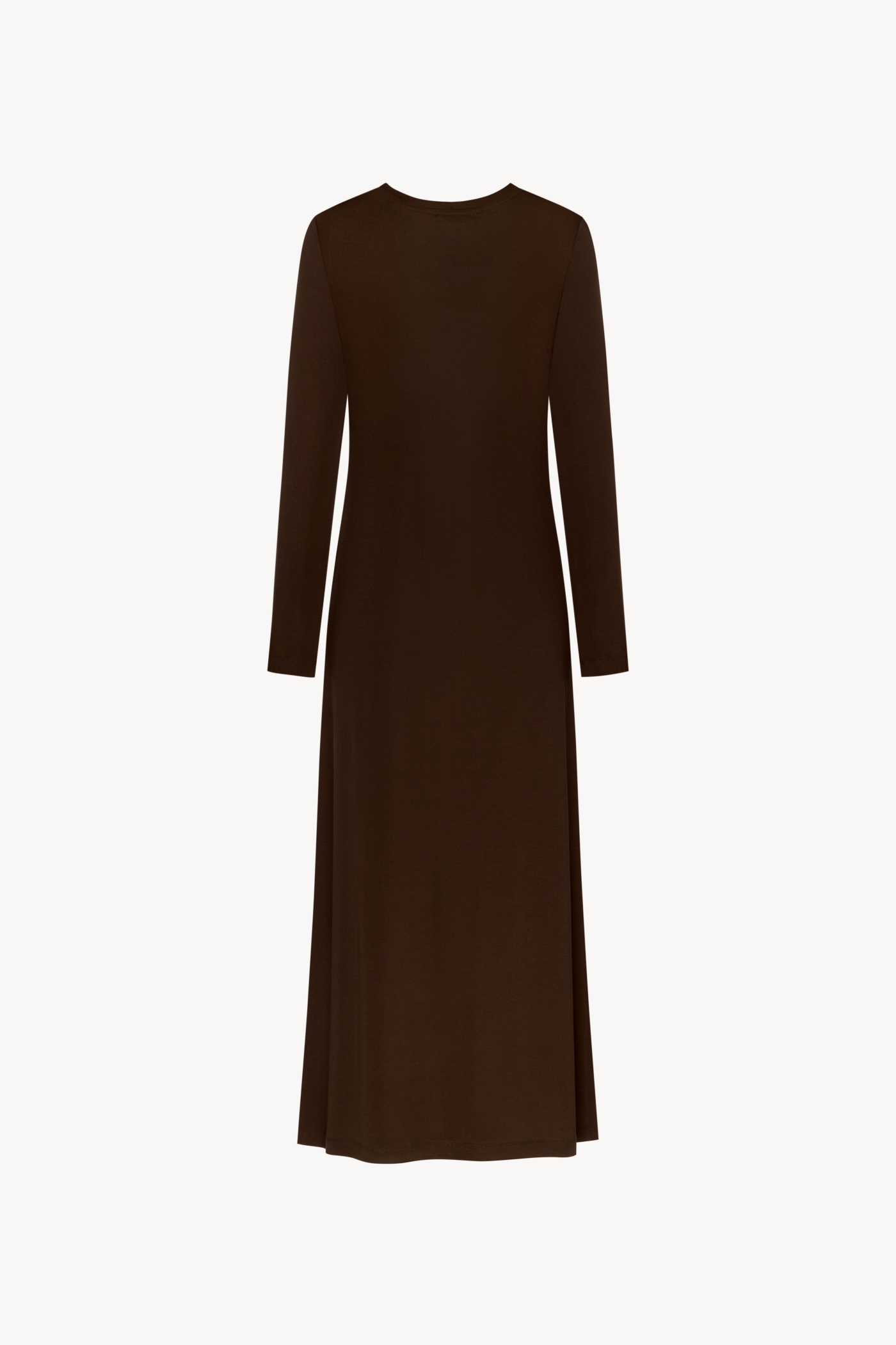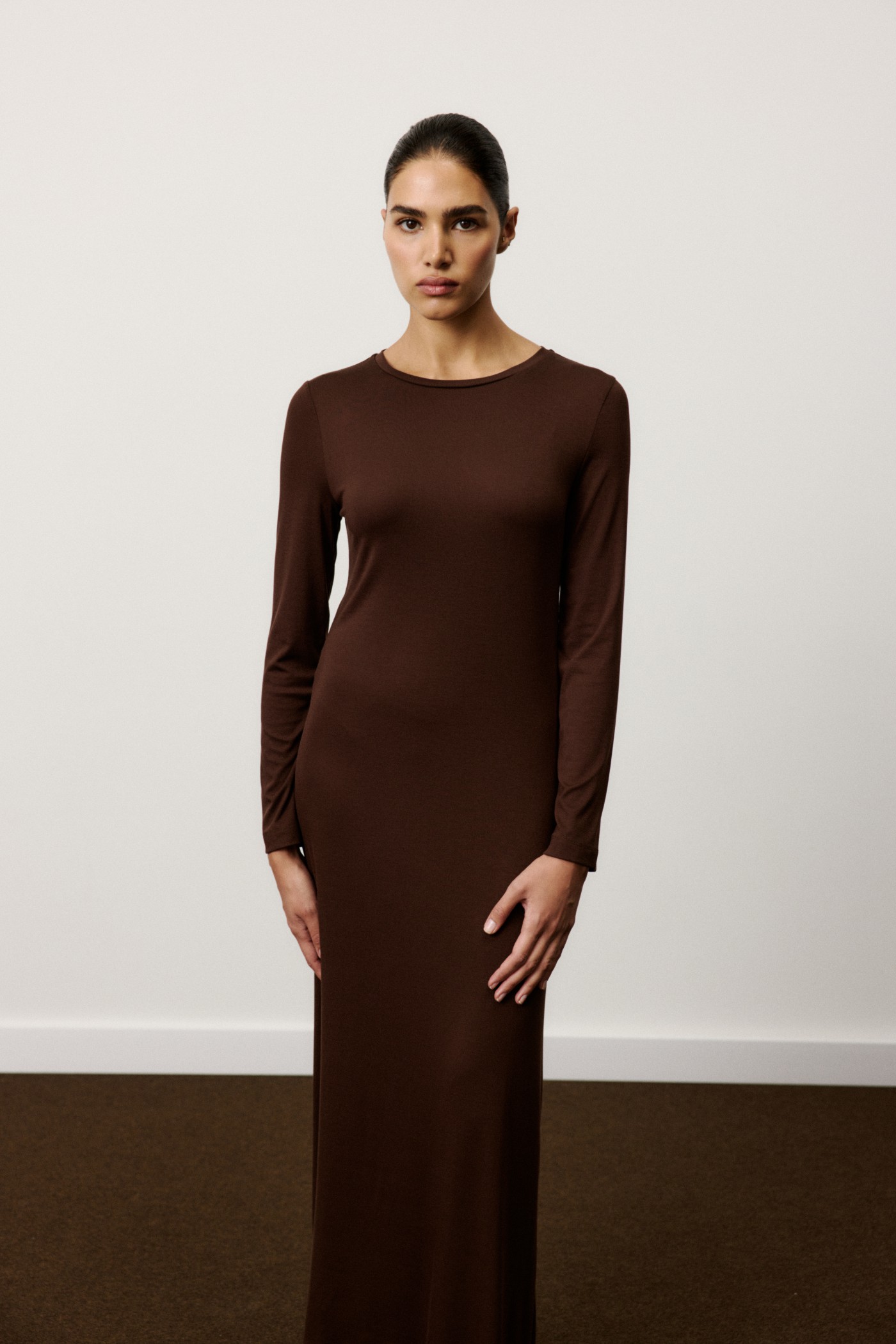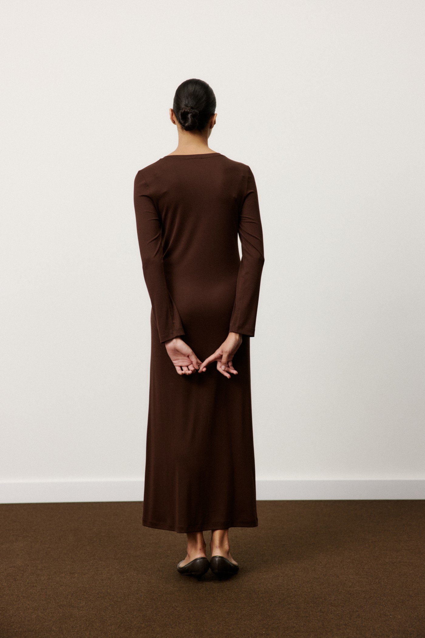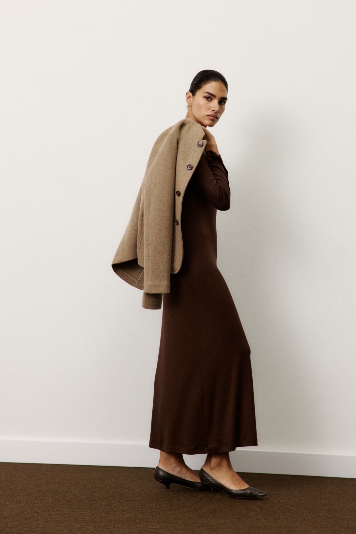 Платье полуприталенного силуэта длины миди из струящегося шелковистого трикотажа.