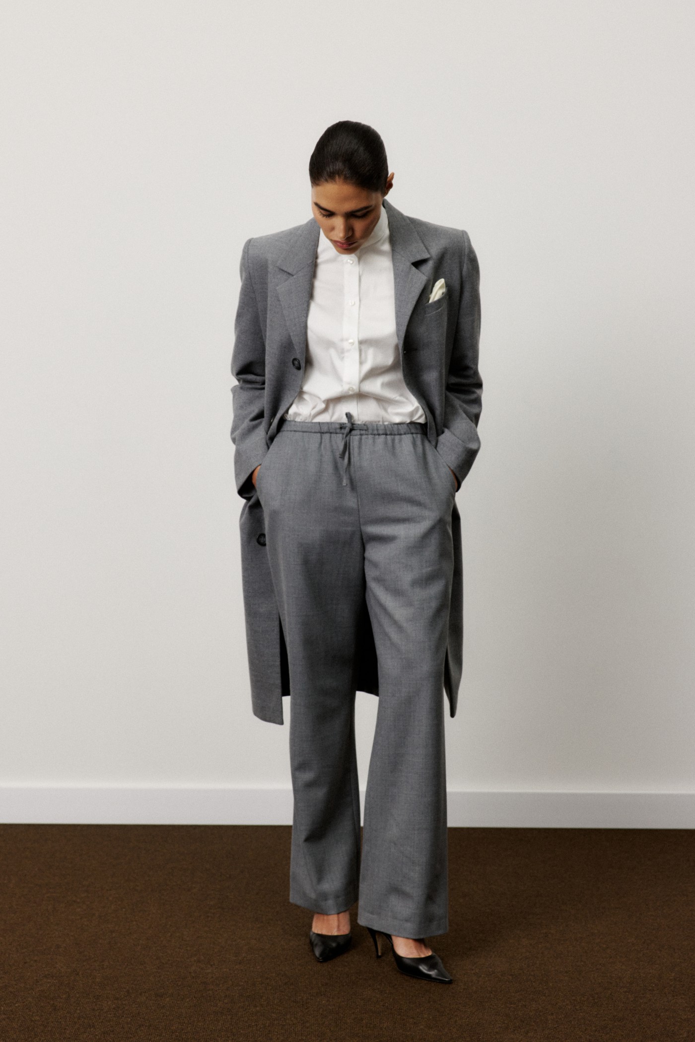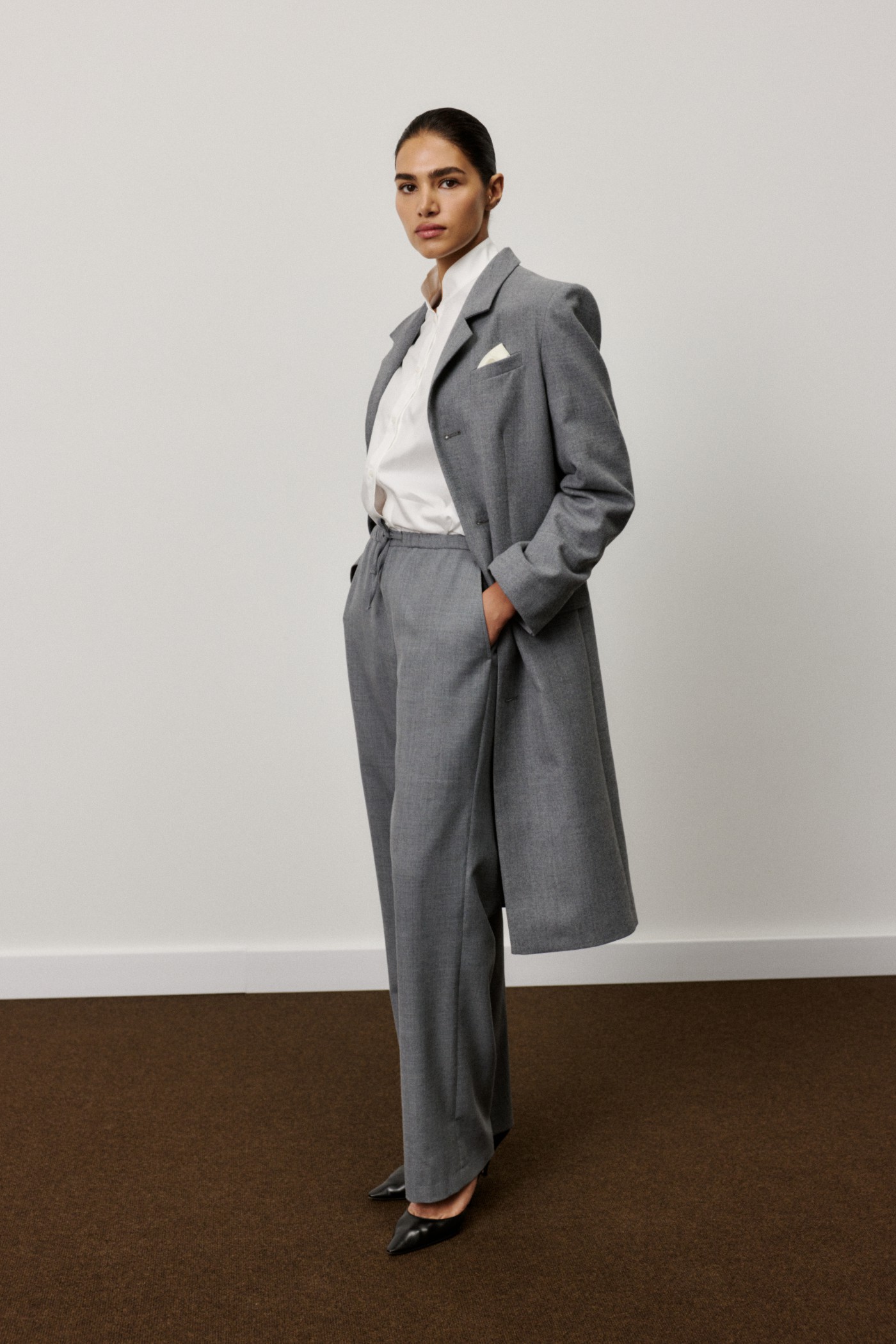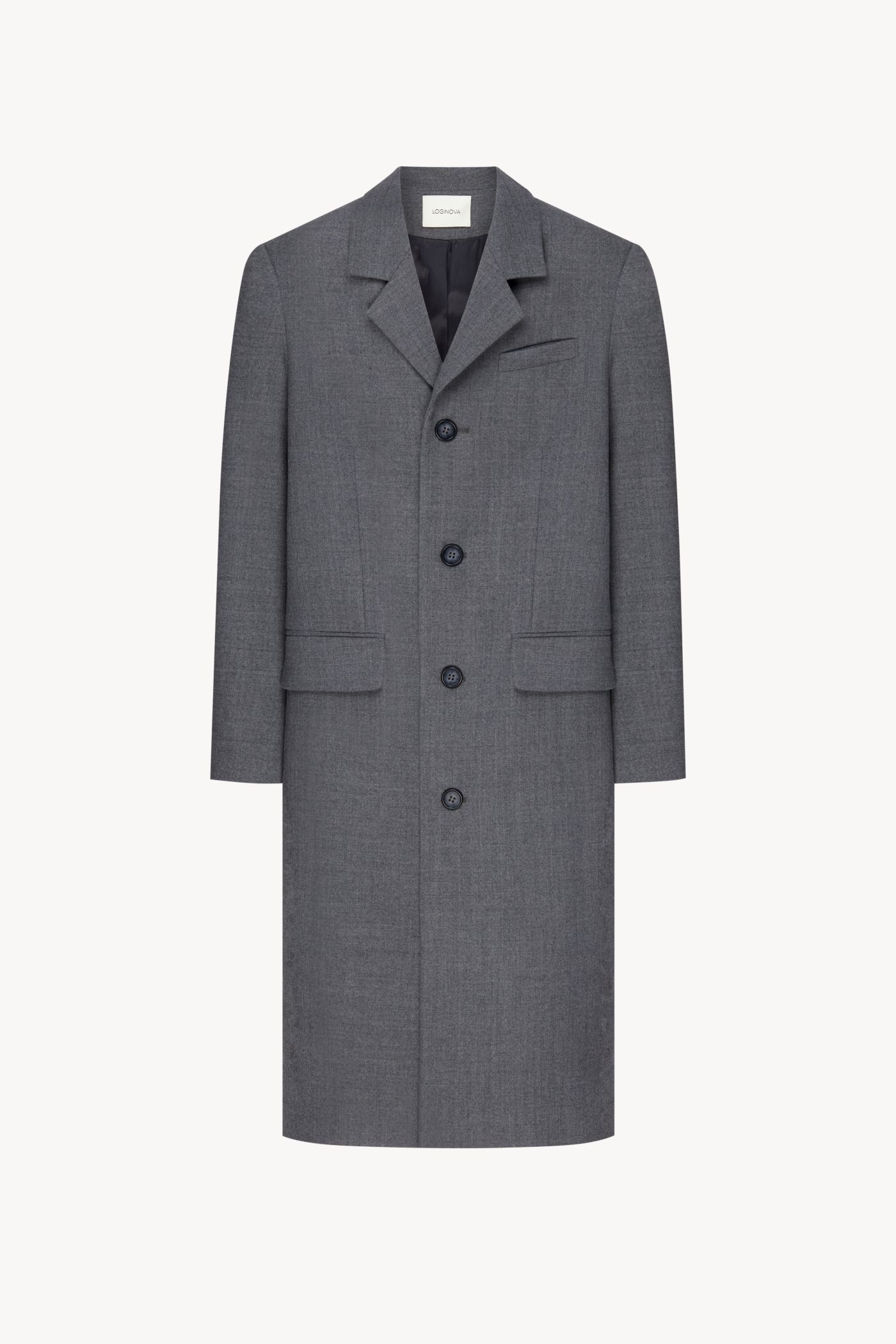 Удлиненный жакет-пальто прямого кроя на пуговицах из шерсти.