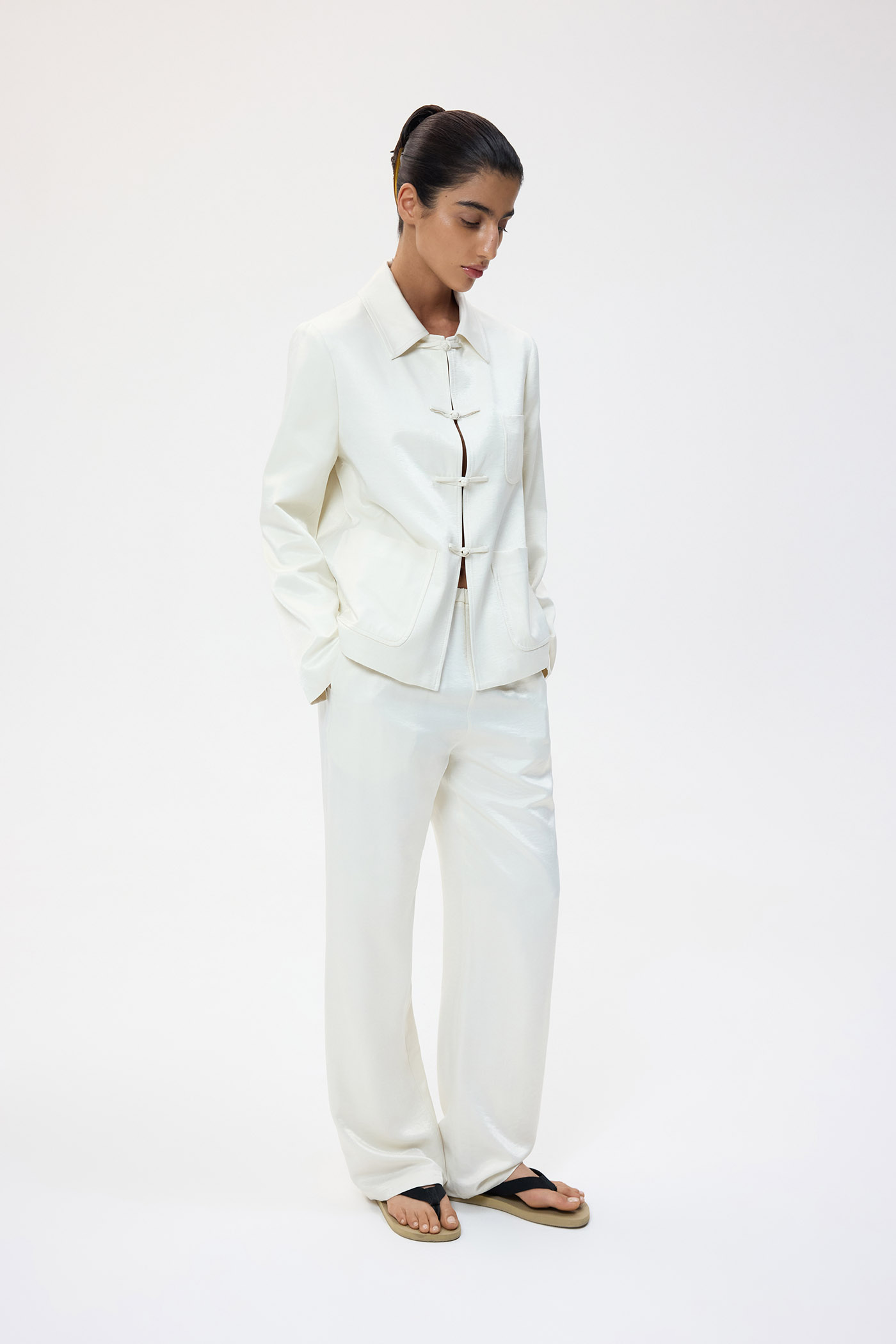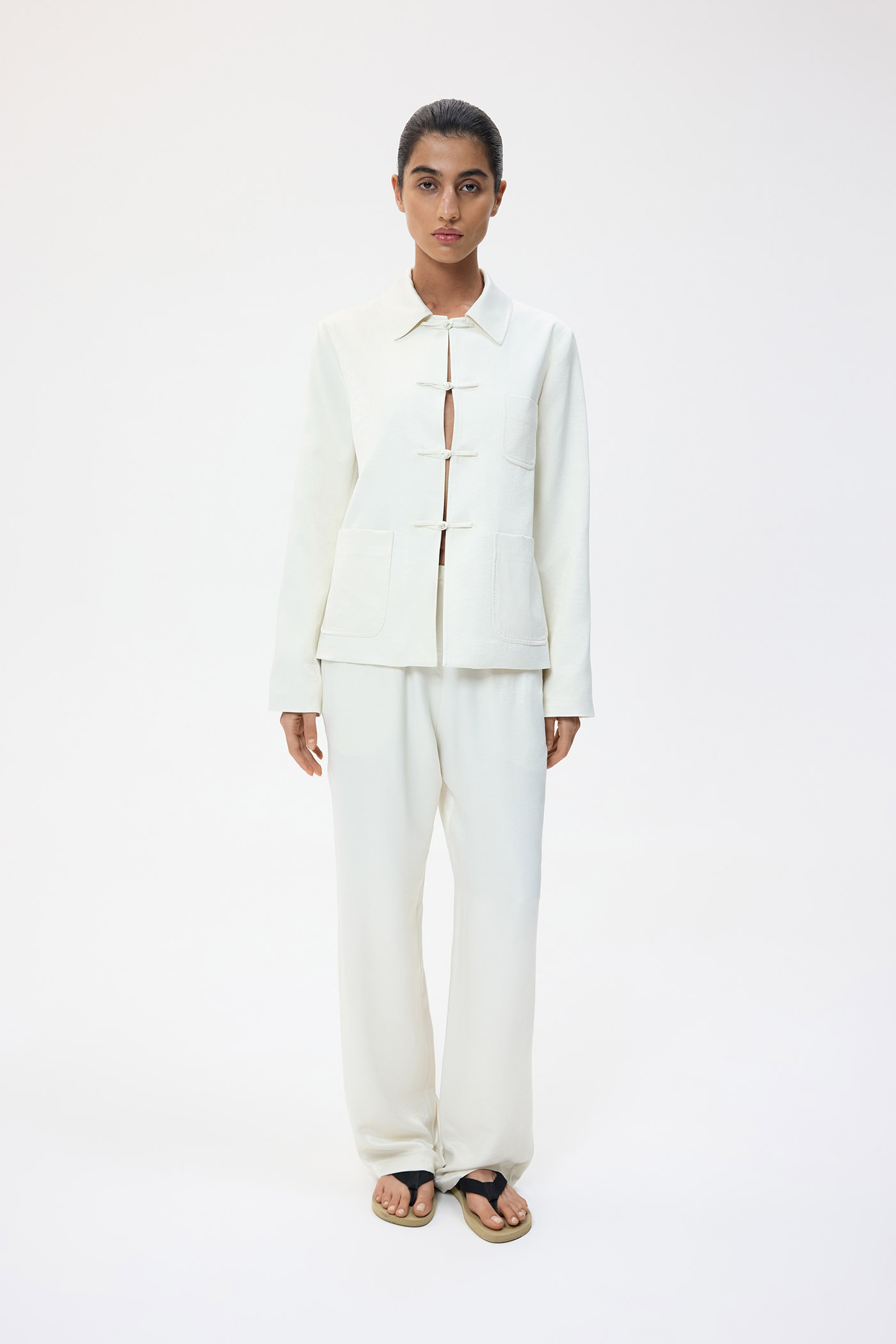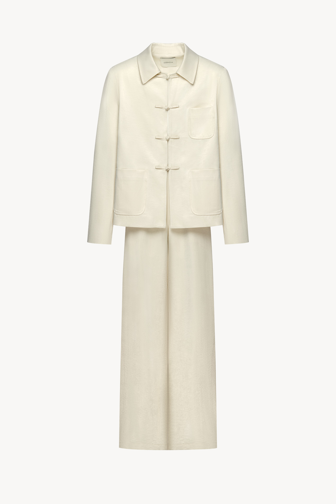 Костюм представляет собой современное прочтение японского стиля: жакет прямого кроя с карманами дополнен брюками на мягкой резинке. Внимание к деталям здесь проявляется в ручной отделке — петли и штрихи на ткани выполнены мастером вручную, что придает комплекту особый характер. Плотный атлас с деликатным блеском хорошо держит форму и почти не мнется, а подкладка из натурального хлопка позволяет телу дышать в течение всего дня.