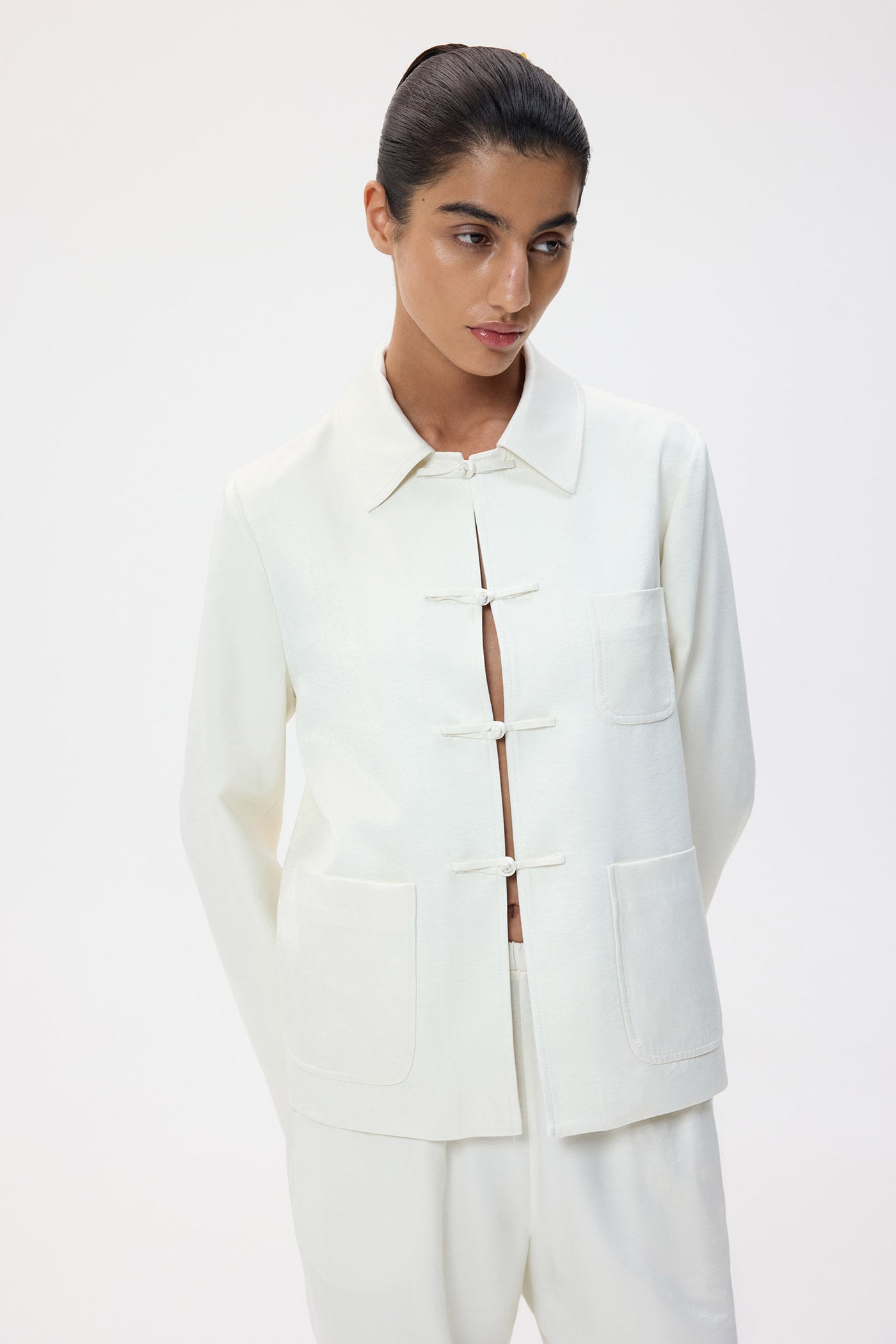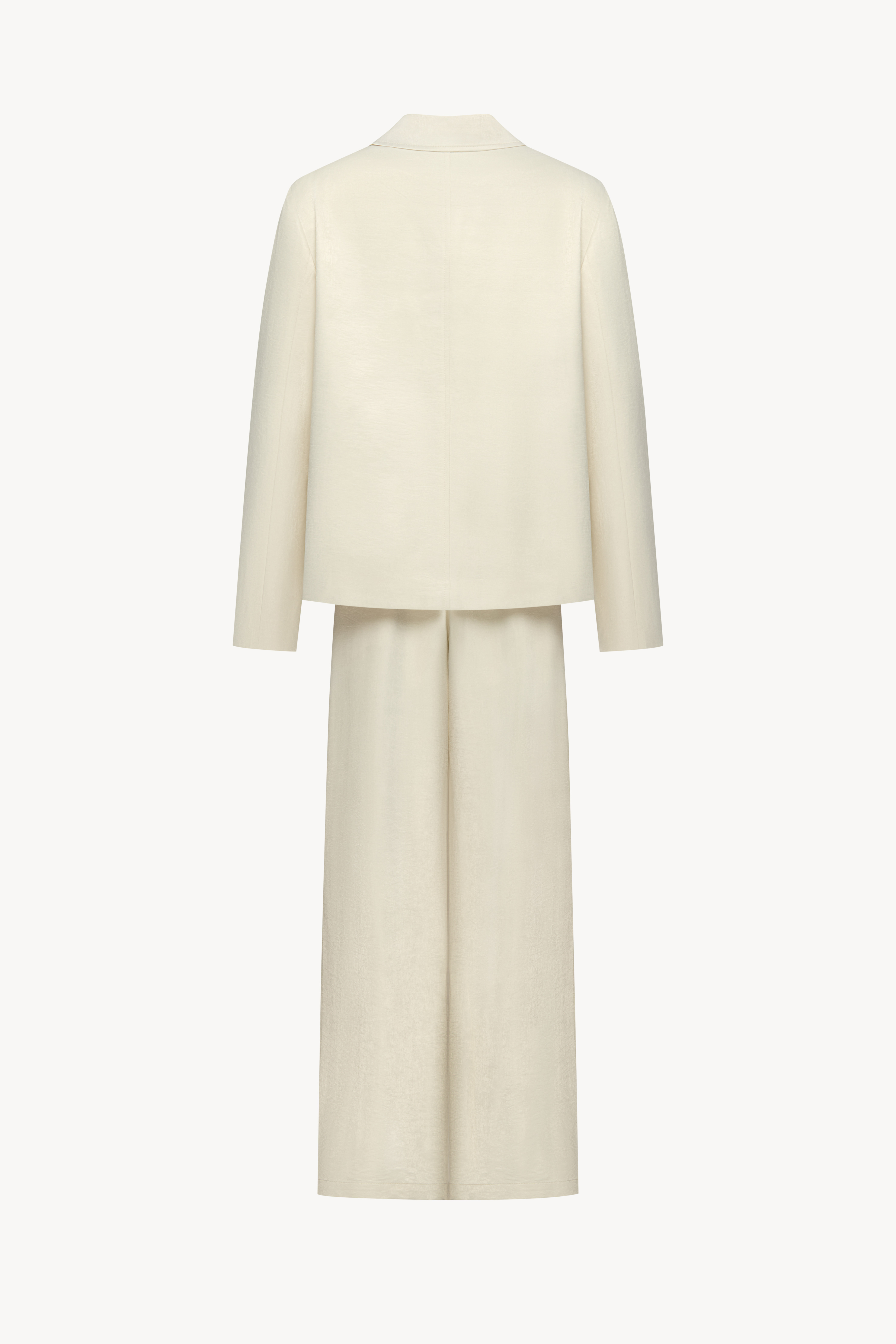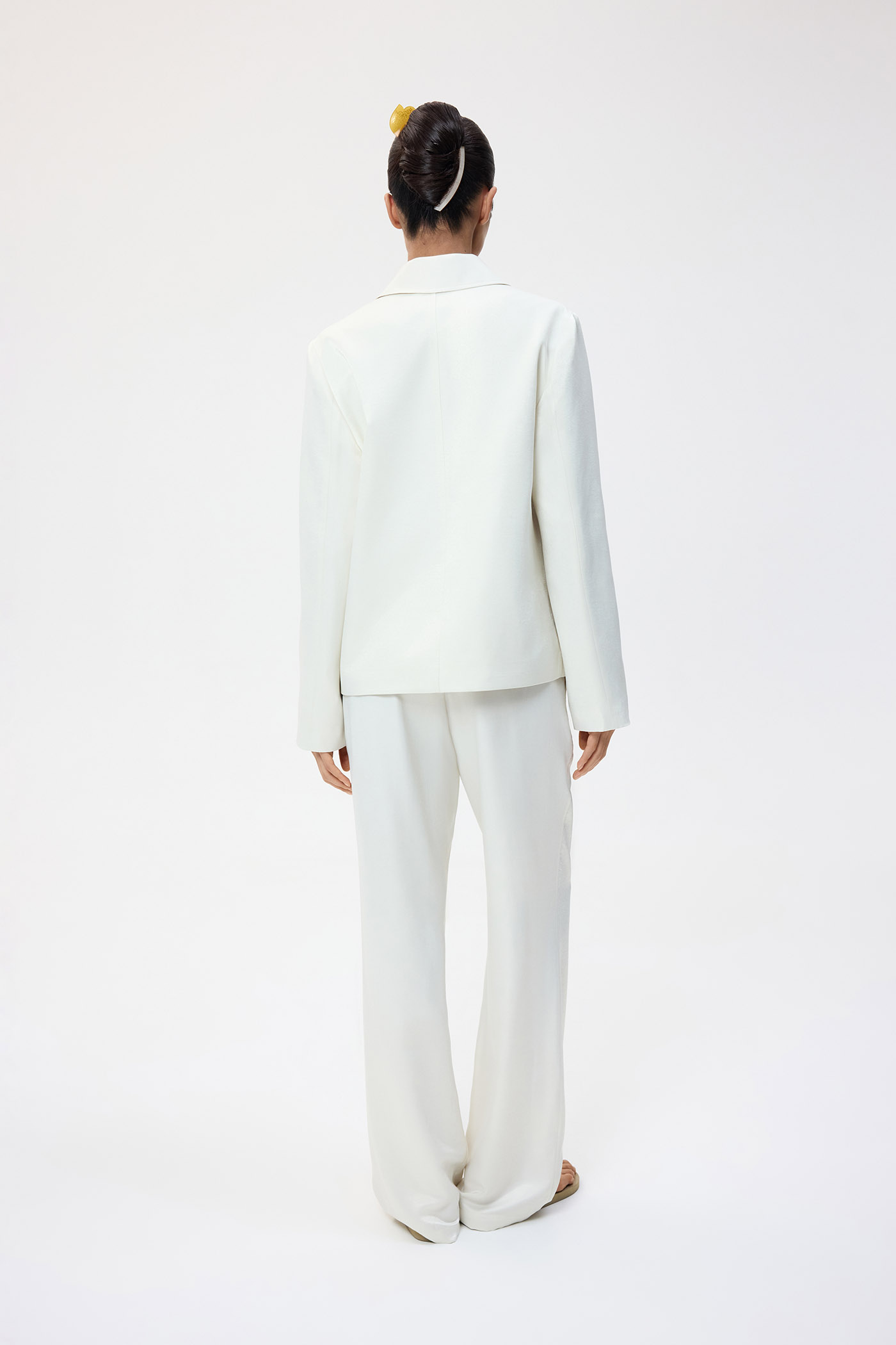 Костюм представляет собой современное прочтение японского стиля: жакет прямого кроя с карманами дополнен брюками на мягкой резинке. Внимание к деталям здесь проявляется в ручной отделке — петли и штрихи на ткани выполнены мастером вручную, что придает комплекту особый характер. Плотный атлас с деликатным блеском хорошо держит форму и почти не мнется, а подкладка из натурального хлопка позволяет телу дышать в течение всего дня.